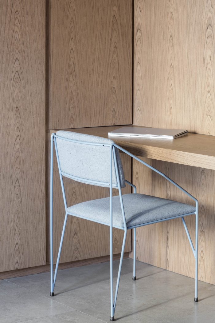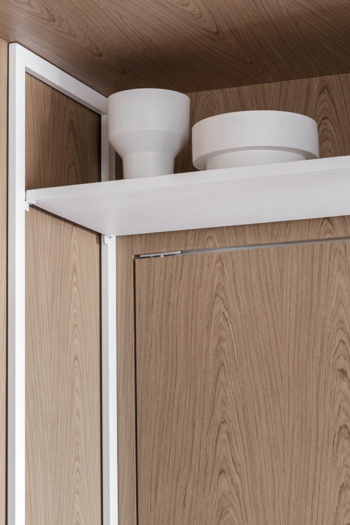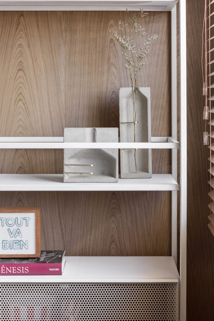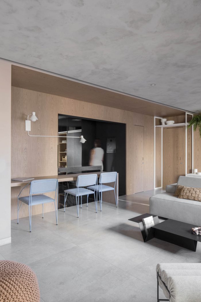 The concrete main room, embraces the first wooden frame, the office mimicked in the room (through its doors, panels and wooden bench) which, turns into the frame of a black monochrome kitchen. The kitchen appears as a striking element in the room, breaking visual expectations and bringing a new possibility to this fluid service area in the living room, sectorized and integrated, with personality and visual identity.