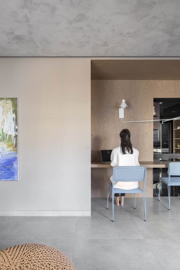 混凝土的主房间拥抱着第一个木制框架,办公室模仿了房间(通过其门、面板和木凳),变成了一个黑色单色厨房的框架。厨房作为一个引人注目的元素出现在房间里,打破了视觉预期,为客厅里这个流动的服务区带来了一种新的可能性,部门化和一体化,具有个性和视觉特征。
