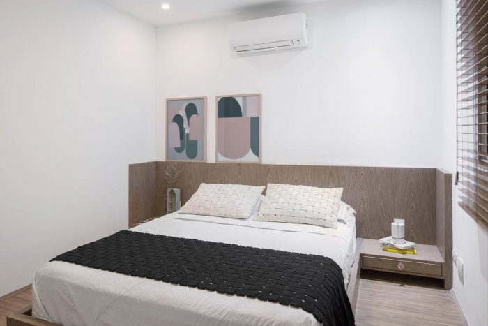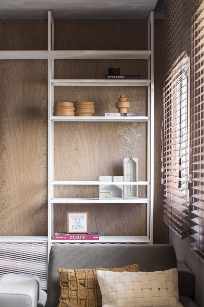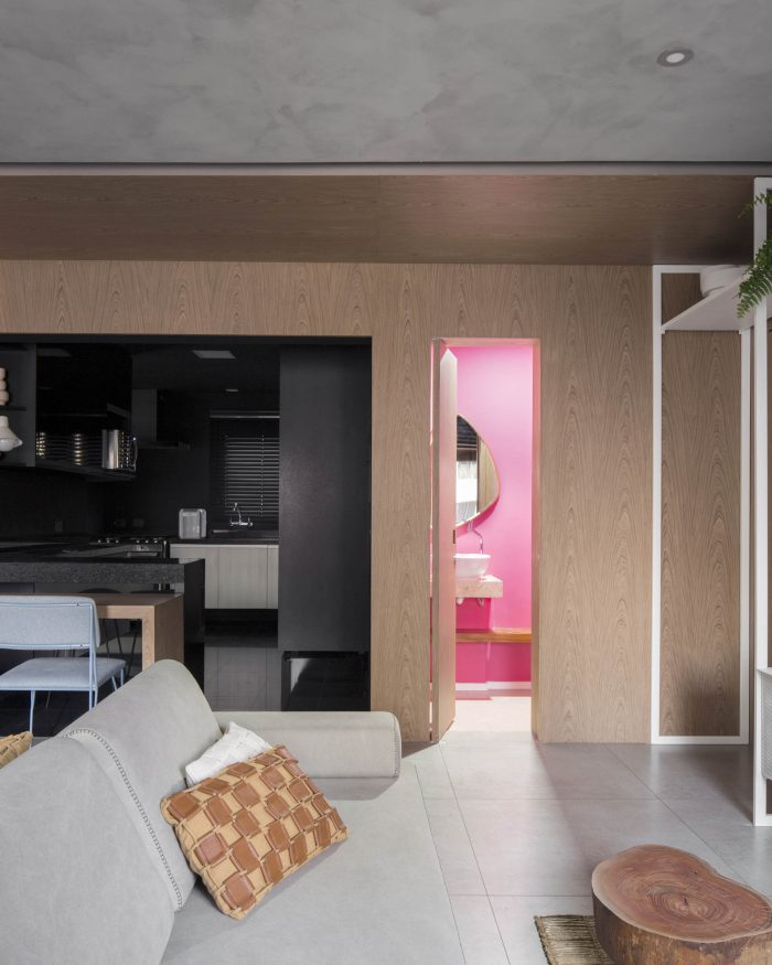 The language of monochromatic sectors, grey room, office and home theater in wood, black kitchen, follow with the pink toilet. The lightness of the white walls occurs in the bedrooms, working with warm touches, the wooden sheet of the furniture and the upholstery of the bed.