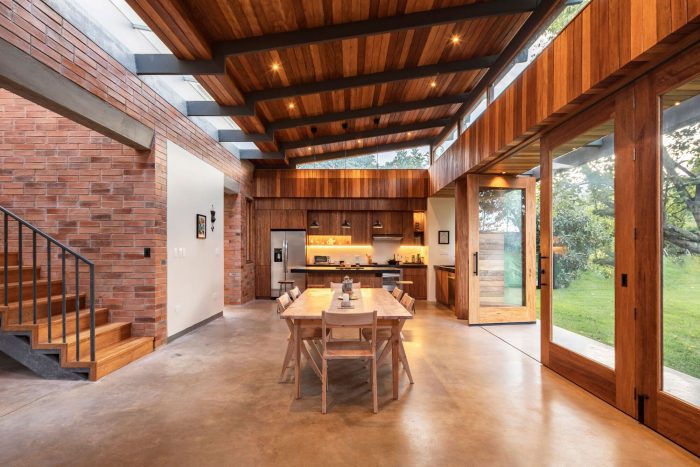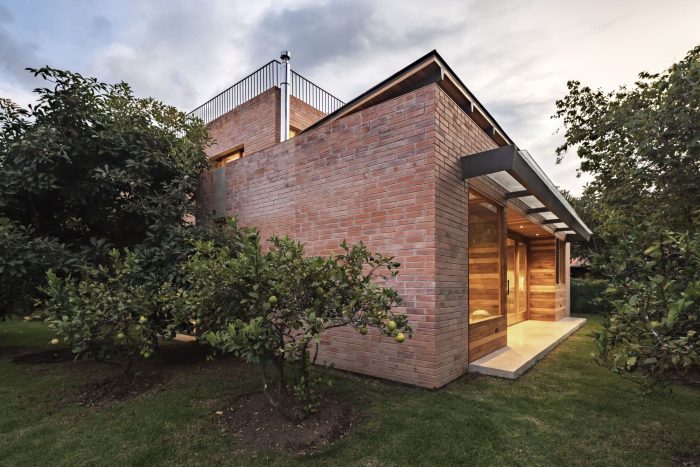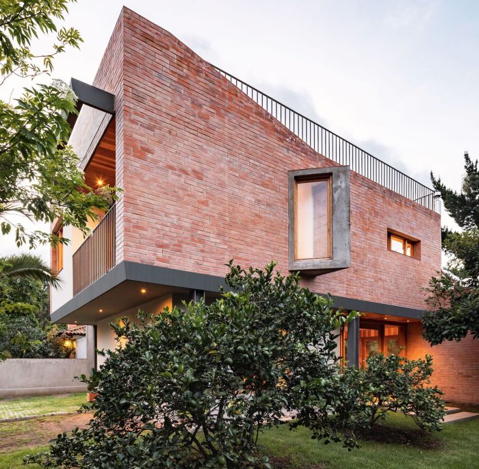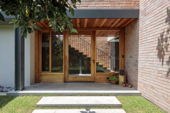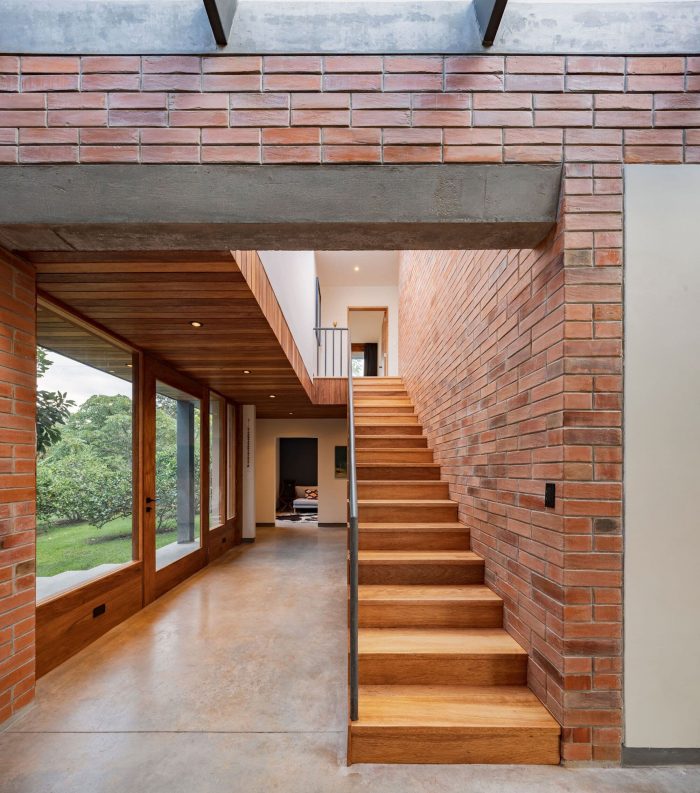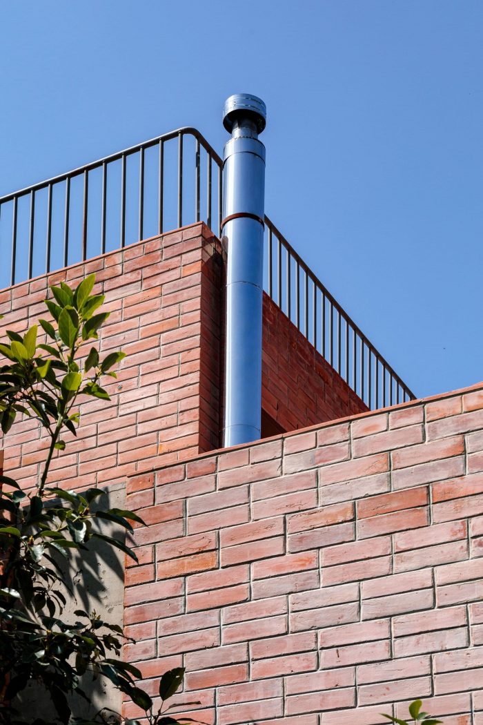 The character of the house is manifested in the predominance of expressive materials such as exposed brick, steel, wood, and their careful arrangement. The dimensions of the 27x13x7cm brick characterize the modulation of the exterior and interior facades, using a block bond assembly, a combination of the stretcher and stack bond. Two courses are laid in stack bond and the next two courses are laid while staggering by half a brick, giving a special texture to the large ceramic planes. The facade is built of a double wall, and behind the brick is hidden a ventilated air chamber that prevents the negative effects of humidity, improves the internal thermal comfort of the house, adds warmth, and reduces heat loss.