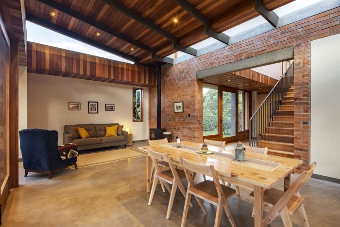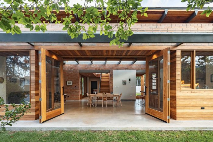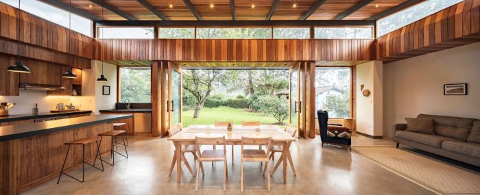 Following the vestibule, a diaphanous space of light appears which contains the social area and captures the rear garden trees and the stream. This social space is wide, open, and flexible. The levitating wooden roof shelters a large living room that opens inviting the garden inside. This place of stay exudes material texture, freshness, and multiple transparencies. The relationship between interior and exterior is blurred through large folding doors that allow the garden to enter the living room and vice versa.