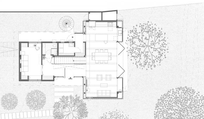 在建筑干预之前,有一块成熟的树地:从第一笔开始,现有植被的雄辩存在就被捕捉到了,这决定了建筑体量的位置,它战略性地避开了树木,回应了场地的前后状况。