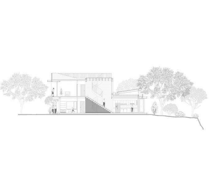 A mature tree lot preceded the architectural intervention: from the first stroke, the eloquent presence of the existing vegetation was captured, which determined the position of the architectonic volumes that strategically avoided the trees and responded to the front-back condition of the site.