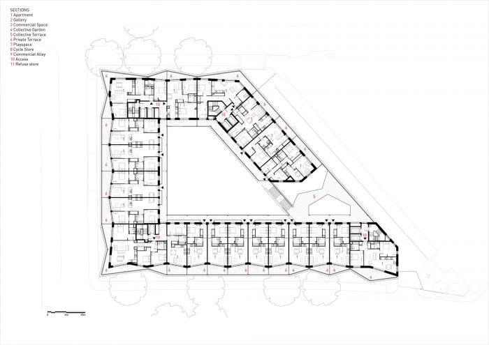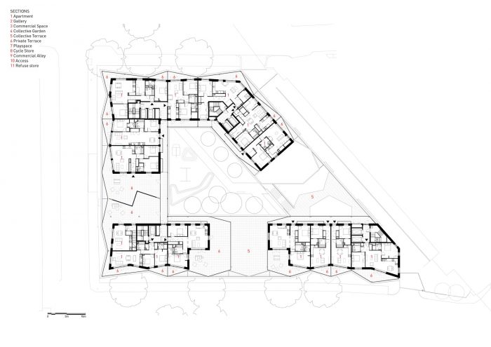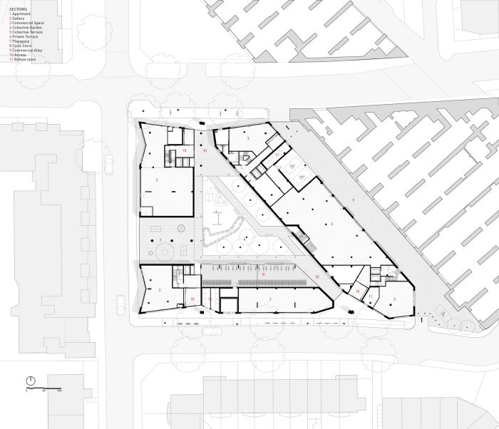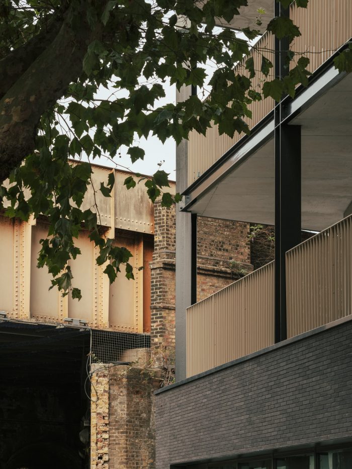 该方案占据了一个前工业用地,周围是住宅区和铁路高架桥,包含了私人、共有产权和社会住房的使用权。商店、餐馆和咖啡馆以及手工食品生产商和批发商混合在一起,位于地面和邻近的铁路拱门内,这构成了南华克 "低线 "铁路拱门更广泛复兴的一部分。