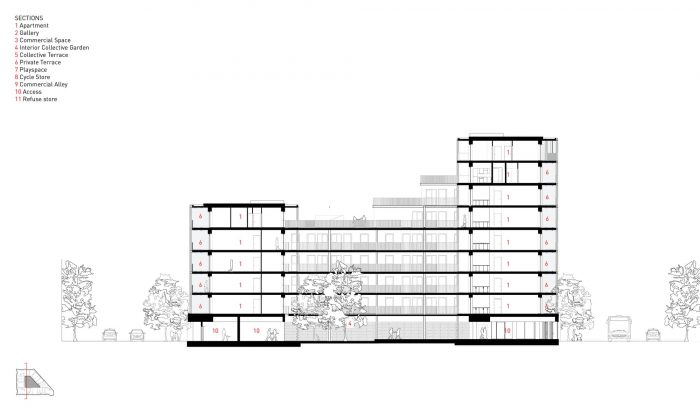 Comprised of a combination of 1, 2, and 3-bed units, all residents benefit from large, shaded balconies and naturally ventilated dual-aspect apartments. Drawing on European collective housing where significant design attention is given to communal space, the new development provides generous outdoor amenity space that delivers social impact and a sense of well-being for its residents. The residential units are arranged around a shared courtyard that includes dedicated children’s play spaces. Residents access their homes from wide galleries that circulate and overlook the communal courtyard and extend onto roof terraces on the first, fourth, and fifth levels which have planting and benches.