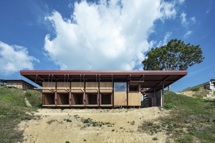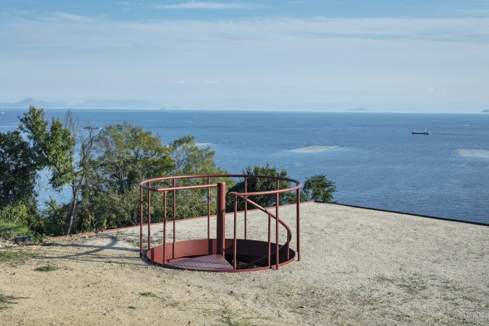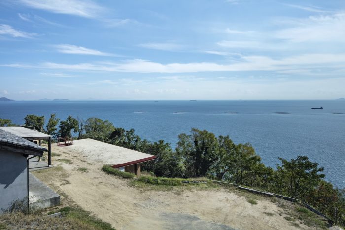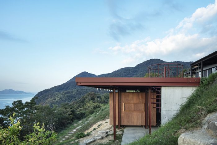 Inspired by the image of shukubo (accommodations operated by temples and shrines,) we designed the guesthouse under the name of "dokubo" (solitary quarters) as a place for children to disconnect from this world and return to their solitude. It has five sleeping units a shower and a toilet and sits in front of the main house's dining room, where they have their meals. The roof is aligned with the floor level of the dining room to avoid blocking the view of the sea from the dining room. A spiral staircase facing the sea leads down from the dining room to the lower floor and descends to the approach to the solitary quarters as if going underground. Upon entering the quarters, one encounters a panoramic view of the Seto Inland Sea, and the front door to each room is a window that automatically swings up and down at the touch of a button. It is a place to confront solitude while facing the sea.