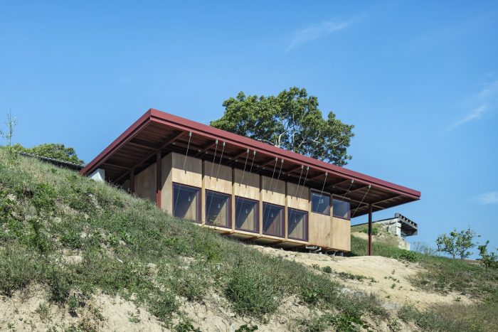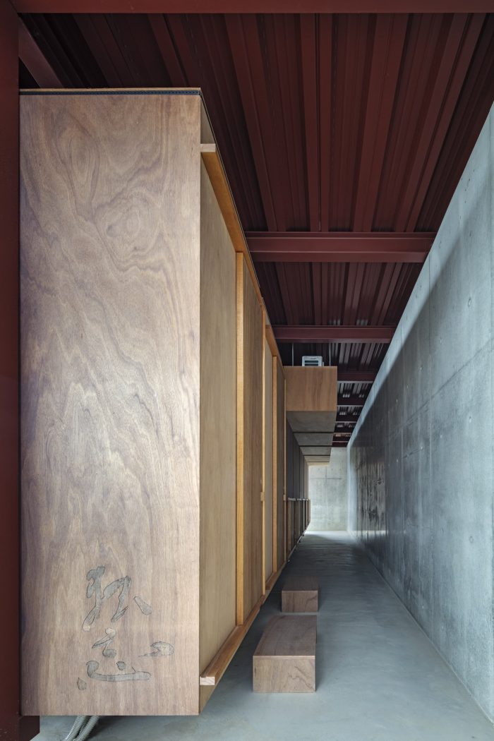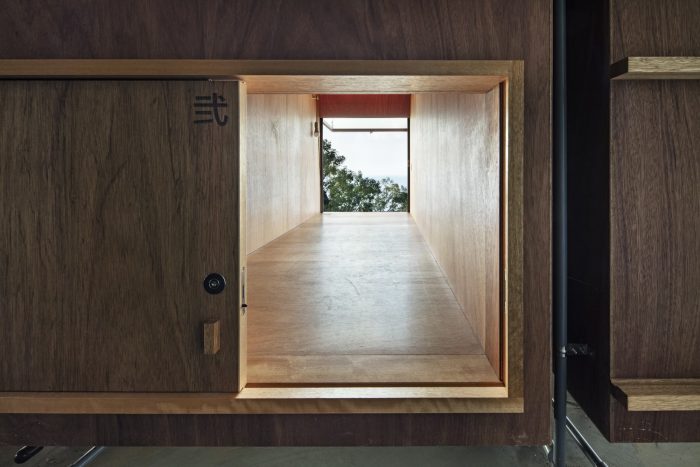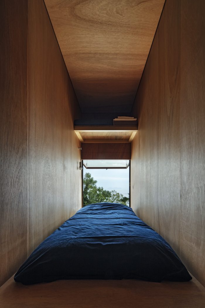 受shukubo(由寺庙和神社经营的住宿设施)形象的启发,我们以 "dokubo"(孤独的宿舍)为名设计了宾馆,作为儿童脱离这个世界并回归孤独的地方。它有五个睡眠单元,一个淋浴和一个厕所,位于主屋的餐厅前面,是他们吃饭的地方。屋顶与餐厅的地板水平一致,以避免挡住从餐厅看到的大海。一个面向大海的螺旋形楼梯从餐厅通向下层,并下降到通往独居者宿舍的通道,就像进入地下一样。进入宿舍后,人们会看到濑户内海的全景,每个房间的前门都是一扇窗户,只要按一下按钮就能自动上下摆动。这是一个在面对大海时面对孤独的地方。