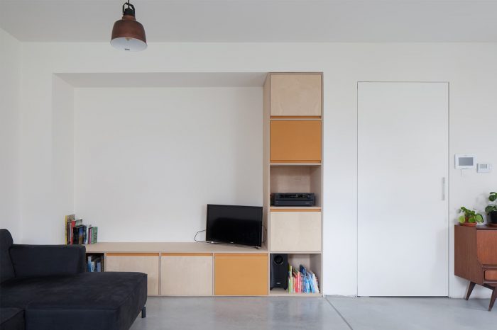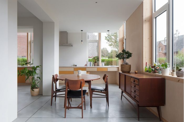 The existing house was just too small to combine a few functional areas (bicycle shed, laundry and ironing room, storage room, cloakroom, etc.) on the ground floor with an office, kitchen, dining room, and living space. Instead of a traditional enlargement of the volume towards the back (the classic Flemish 'extension'), the Ghent-based architecture office Luchtschip opted to accommodate the functional non-residential spaces in the existing -dark- front of the house and to provide the kitchen and dining area, in combination with small office furniture, in a new volume around the living space on the garden side.