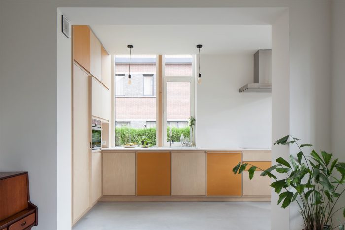 The new volume embraces the existing house in an L-shape. The new facade is placed just far enough from the existing one, creating a usable width for the kitchen on the one hand and the dining area on the other. The enlargement is kept as compact as possible to lose as little as possible the surface area of the (already quite limited) city garden.