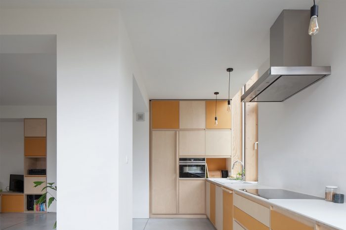 在现有的后墙和侧墙,原有的窗户开口被最大化,这样厨房、书桌和用餐区(在新的体量中)和生活空间(植入现有住宅)在视觉上和功能上都有联系。