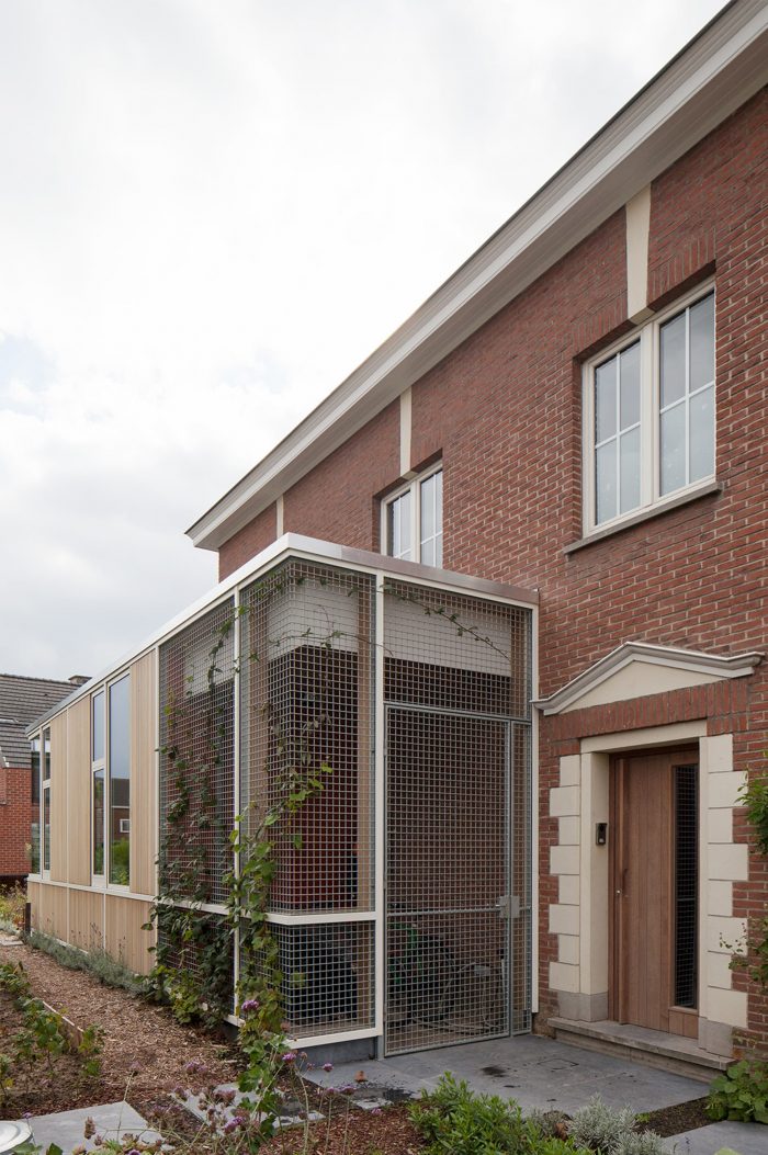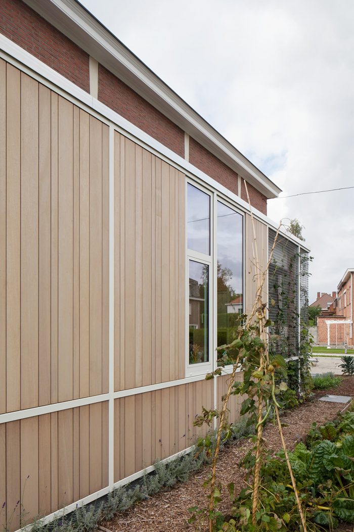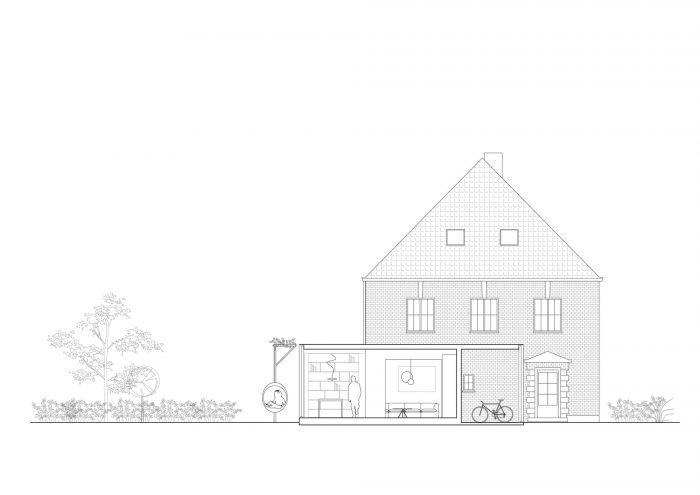The materialization of the new facade reveals the underlying functions: the kitchen and dining area are built in a light timber-framed construction, with the aim being to allow as much light as possible through a multitude of glass, placed in white window frames. The rest of the facade is covered with a wooden cladding that will gray and fade over time, making the entire volume read like a new abstract, a light-colored wrapper around the existing red brick home. The aluminum roof edge subtly defines the new volume.