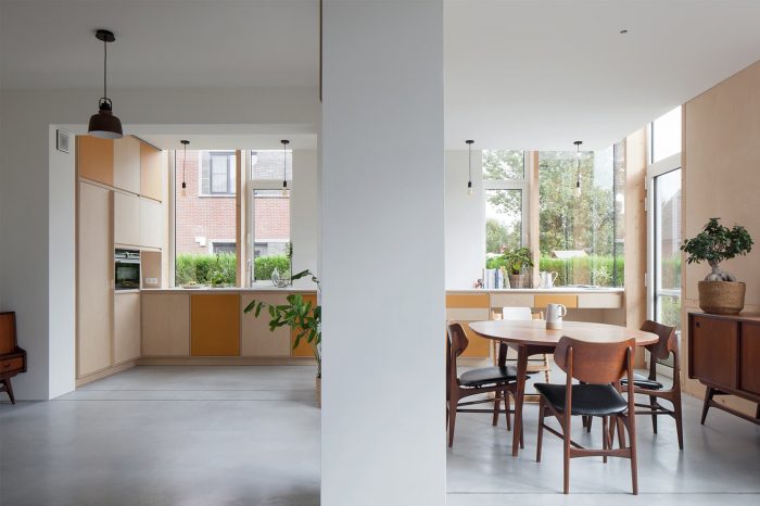 Inside, a new concrete floor runs seamlessly from the existing home to the newly built spaces. The added timber-frame facades are finished on the inside with birch plywood so that there is a clear distinction between the white plastered, existing volume and the added new 'wrap' in wood.