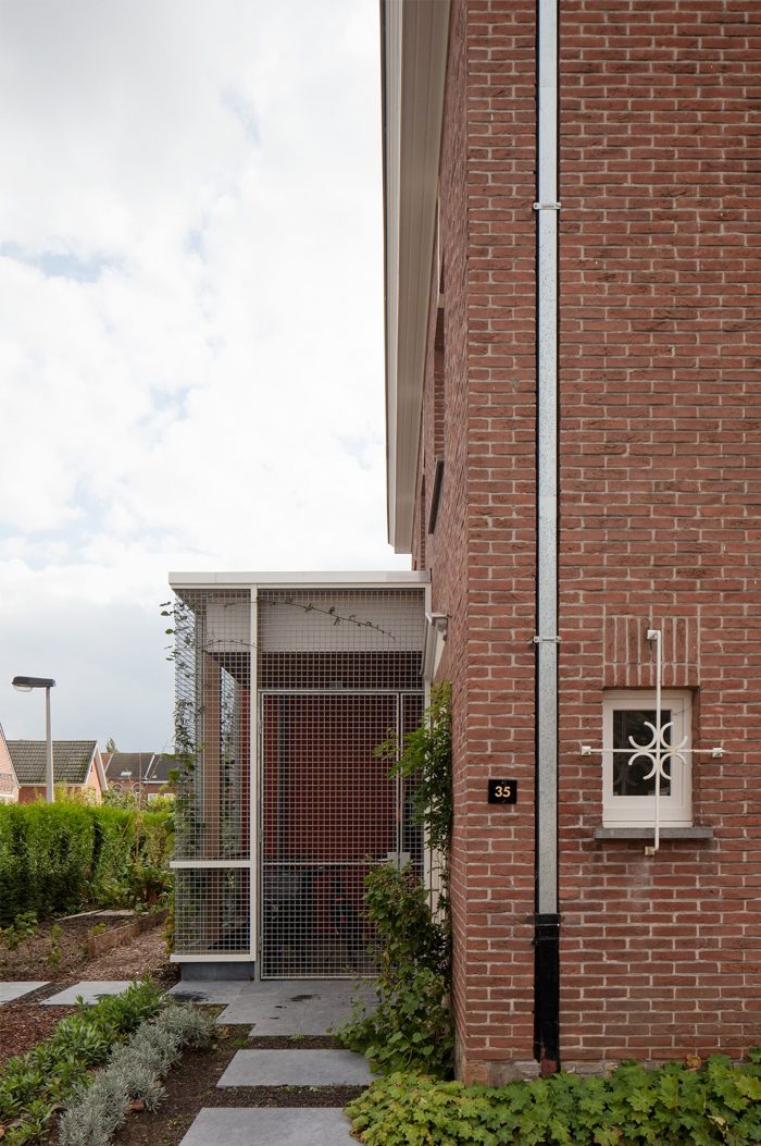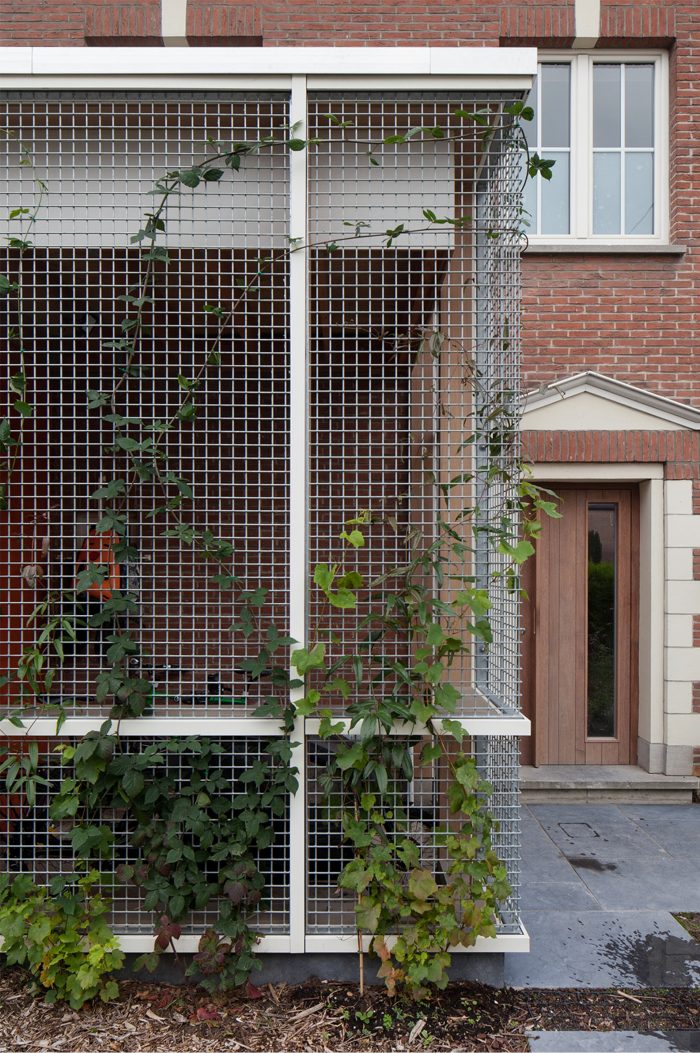 In addition to the kitchen, office, and dining area, the requested bicycle shed is also provided in the new L-shaped volume, which is also clearly legible: a facade cladding made of galvanized steel wire net closes off the storage area and over time will be overgrown by greenery.