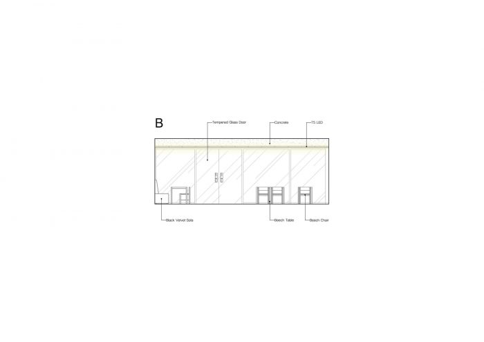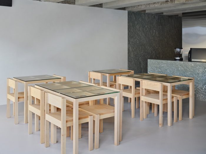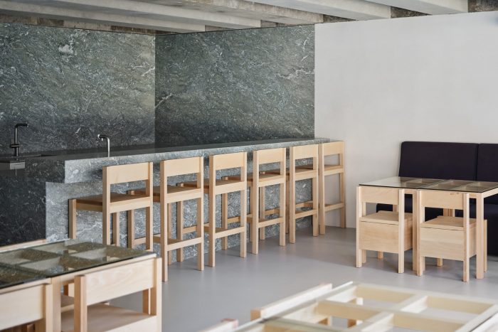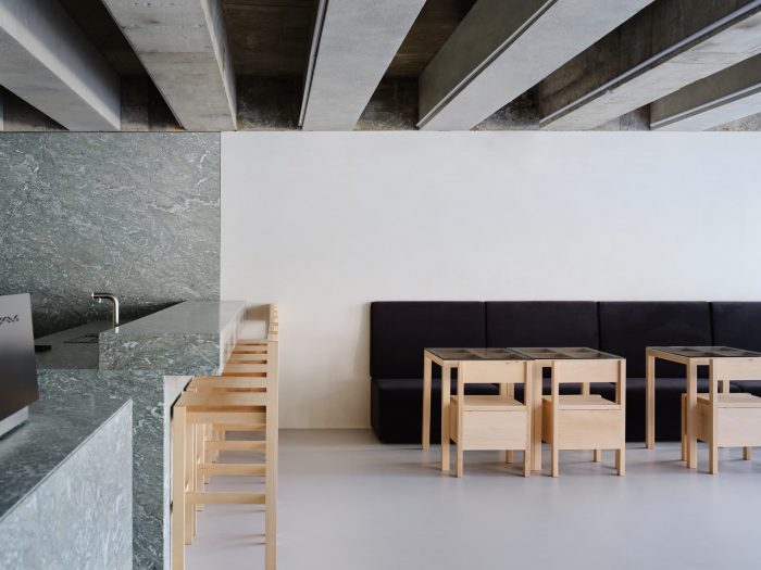 Upon entering the café, what stands out first is linear furniture made of beech, whose bright and soft color gives a cozy and comfortable feeling. It is coated with transparent white oil to avoid corruption from possible contamination. The black sofa on the right wall is made of water-repellent Aqua Polyester Velvet to prevent contamination and its edges are rounded off. The curved black sofa adds a slight air of solemnness to the space, along with the tone and manner of natural materials and the linear gestaltung. The wall and the bar table which surround the espresso coffee bar and the filter coffee bar are covered with Verde Antigua marble. The boundary line of the wall is deliberately arranged at the same line as the front of the bar table so that the space between staff and guests can be separated spontaneously.