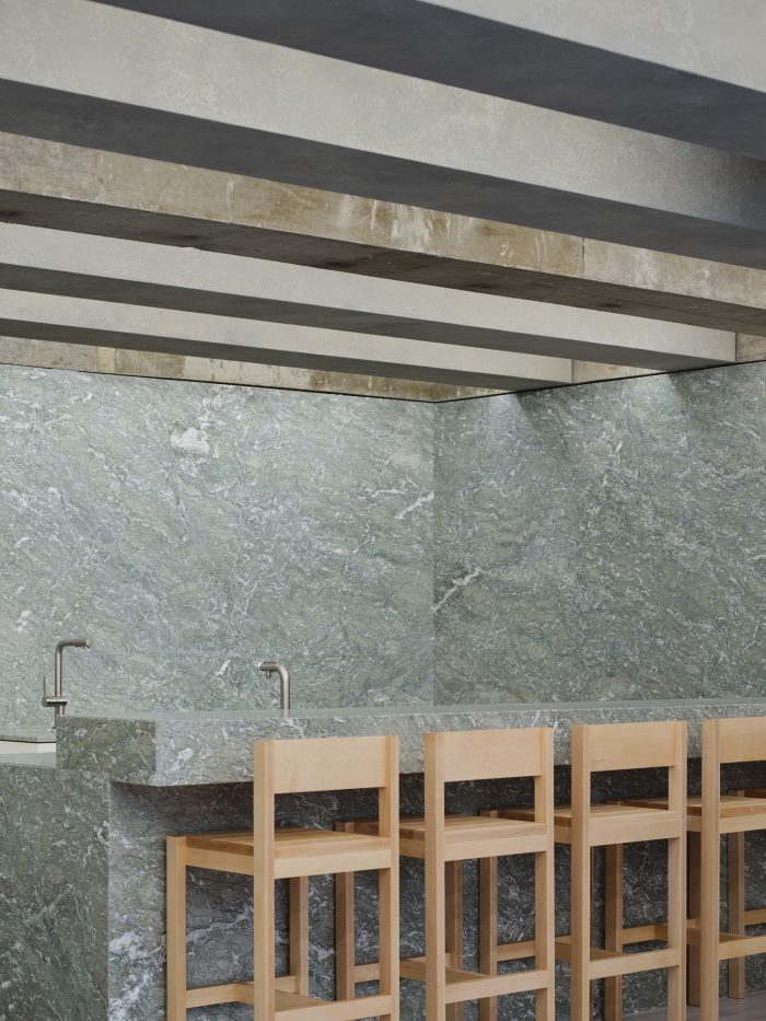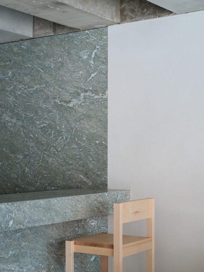 The reason why we chose the Verde Antigua marble is that its delicate and elegant green color with irregular patterns of white and gray goes well with the calm yet vigorous image that “Dorae Knot” aims for. As for the natural marble on the wall, we made maximum use of a whole slab, while minimizing its joint gaps and filling the gaps with grout in customized color to make it look like one large slab when it is completed. The kitchen wall between the toilet partition and the coffee bar is finished with stainless steel lest it should look so cramped, creating a balance with the natural marble at the bar. The floor is cleanly completed with a matt finish on the self-leveling mortar without any patterns or stains to give a calm impression. For taking advantage of two existing beams cutting across the ceiling, additional beams in the same shape are built into the ceiling at regular intervals.