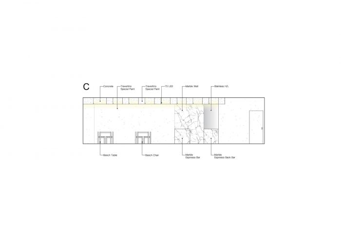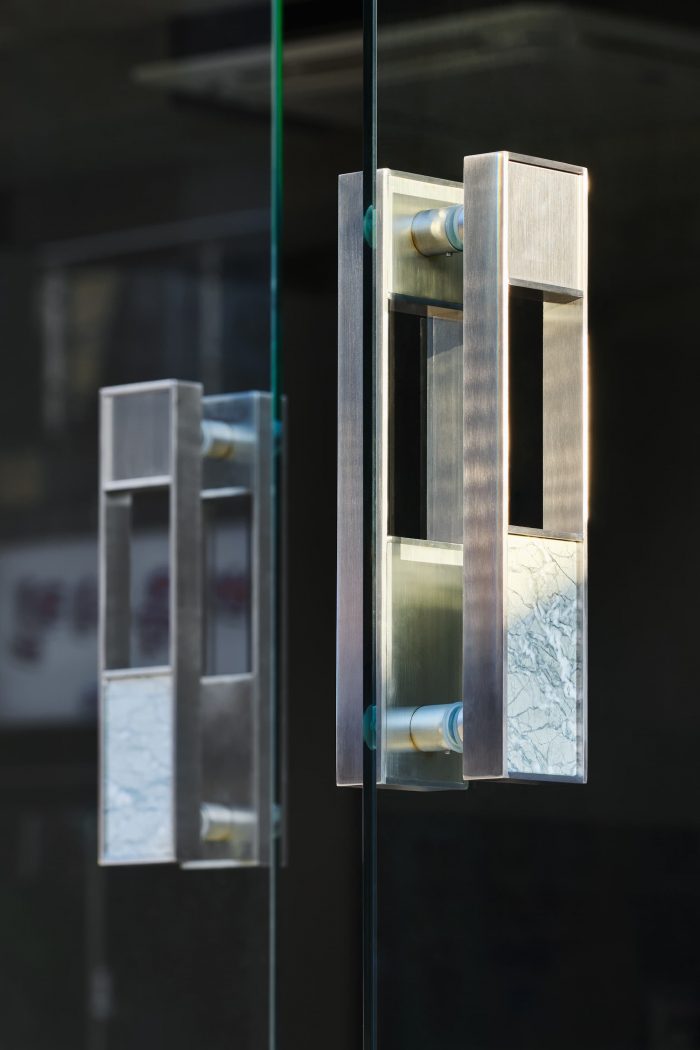 To be in harmony with the exposed concrete of the ceiling, the wooden beam is carefully plastered with a customized color to express its concrete-like texture. Lighting is equipped at the lower part of its side in order not to shade the light due to the presence of repeated beams. The indirect lighting is further intended to obtain a sense of density and depth in space. We chose 4,000K natural white light for a warm and neutral atmosphere, which enfolds such materials as marble, stainless steel, exposed concrete, and epoxy that may seem somewhat cold. While natural marble and stainless steel offer a visual experience indoors, the doorknob made of those materials may provide guests with a tactile experience.