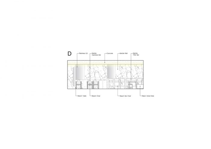 一进入咖啡馆,首先映入眼帘的是山毛榉制成的线性家具,其明亮和柔和的颜色给人以舒适的感觉。它被涂上了透明的白油,以避免可能的污染的腐败。右边墙上的黑色沙发是由防水的水聚酯天鹅绒制成的,以防止污染,其边缘是圆形的。弯曲的黑色沙发为空间增添了一丝肃穆的气息,加上天然材料的基调和方式以及线性格式。围绕着浓缩咖啡吧和过滤咖啡吧的墙壁和吧台是用Verde Antigua大理石覆盖的。墙的边界线特意安排在与吧台前面的同一直线上,以便工作人员和客人之间的空间可以自发地分开。
