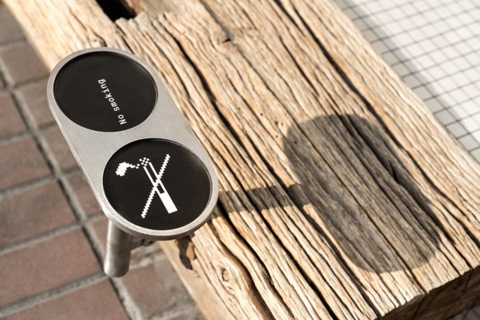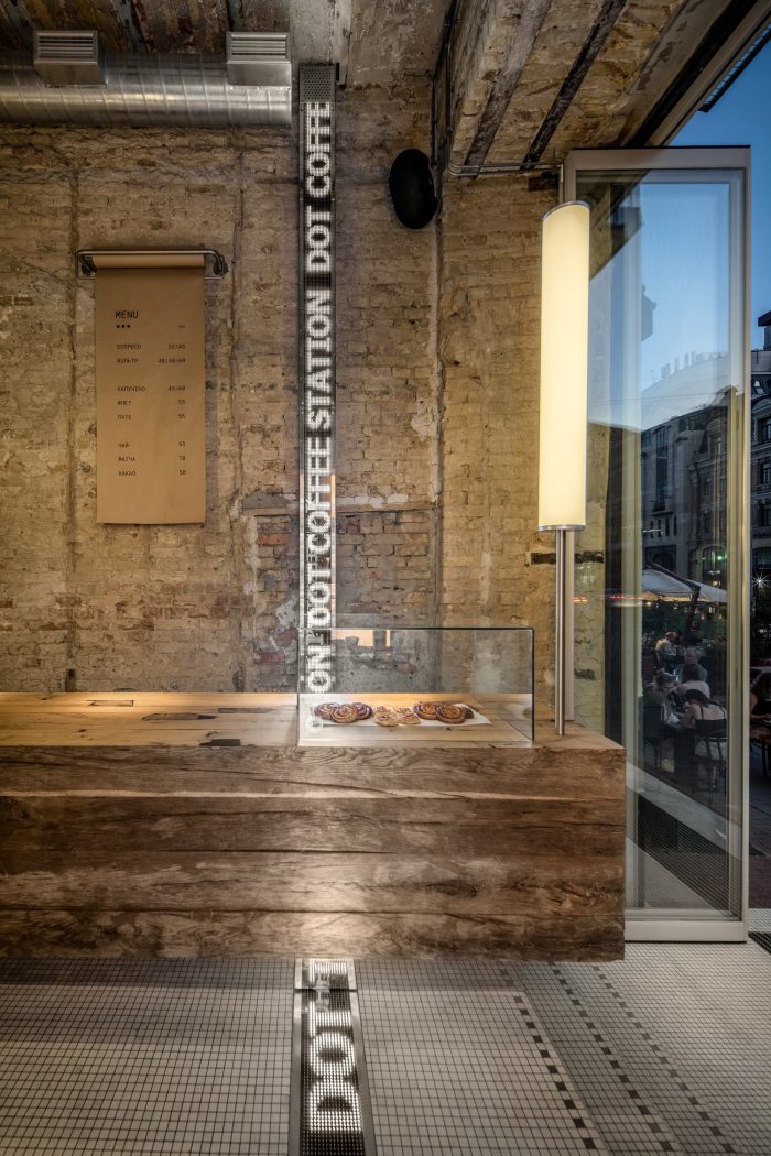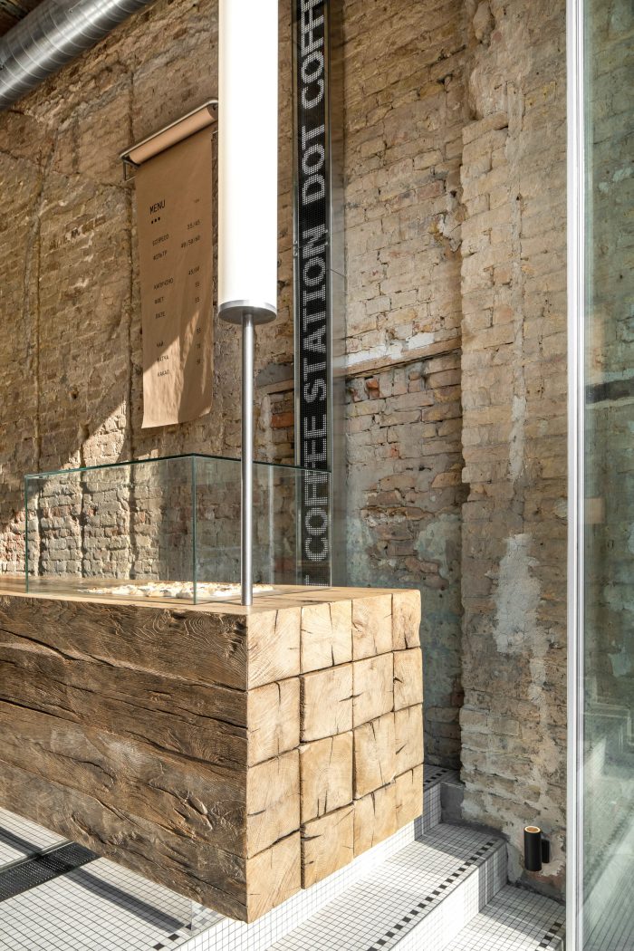 DOT Coffee Station has two little tables and a niche with a bench where a few guests can sit. Another seating place is the massive bench along with the building façade next to the café. The timber on both benches as well as on the counter is old beams that used to be elements of some barn a long time ago. It is a time-proven material that tells its own story and works as a contrast with the perfect and cold elements made of stainless steel.