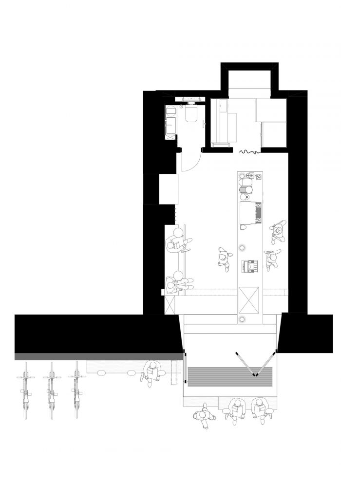 DOT咖啡站有两张小桌子和一个带长椅的壁龛,可以坐几个客人。另一个座位的地方是沿着咖啡馆旁边的建筑立面的巨大长椅。两张长椅以及柜台上的木材都是很久以前作为某个谷仓的元素的旧梁。这是一种经过时间考验的材料,它讲述了自己的故事,并与不锈钢制成的完美和冰冷的元素形成对比。