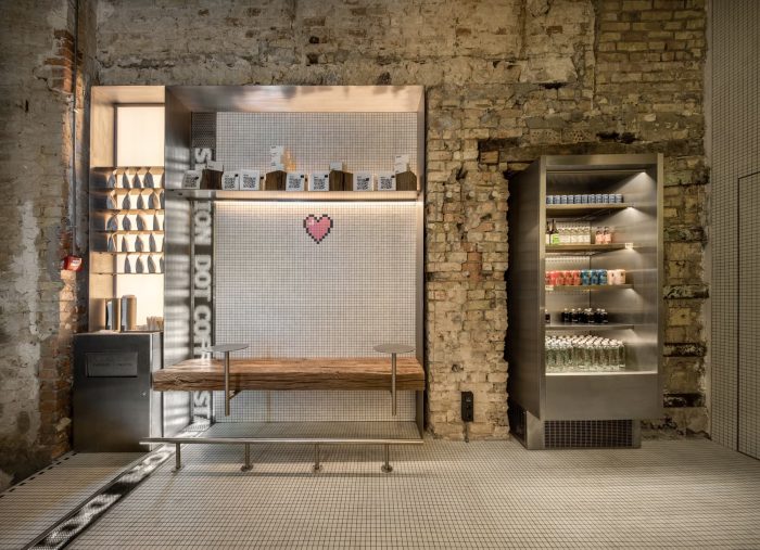 咖啡馆内的楼梯和部分墙面用白色马赛克瓷砖覆盖,并有一些像素艺术元素。其他墙面显示出裸露的砖块,强调了1900年建造的建筑的价值。DOT的天花板的高度是475厘米。我们需要得到一个充满光线的高大空间,所以我们从一开始就放弃了建造有座位的夹层的想法。