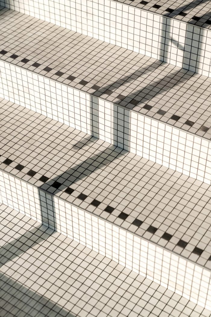The stairs and part of the wall surface inside the café are covered with white mosaic tiles with some pixel art elements. Other walls show the bare brick that emphasizes the value of the building erected in 1900. The height of the ceiling in DOT is 475 centimeters. We needed to get a high space filled with light, so we discarded the idea of building the mezzanine with seating places from the very beginning.