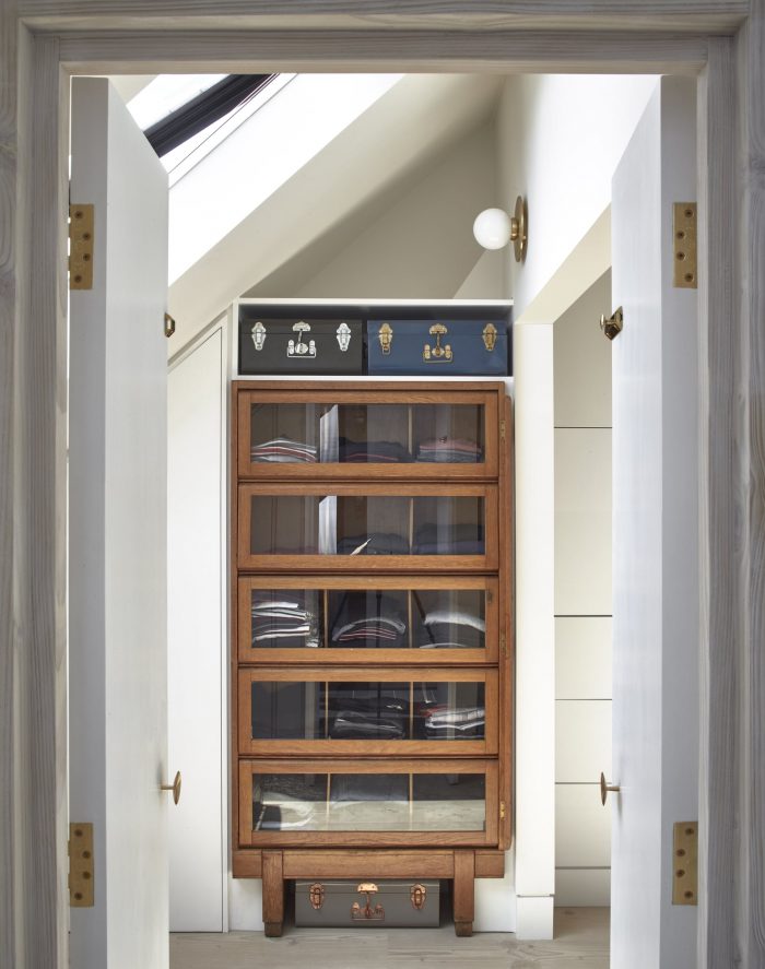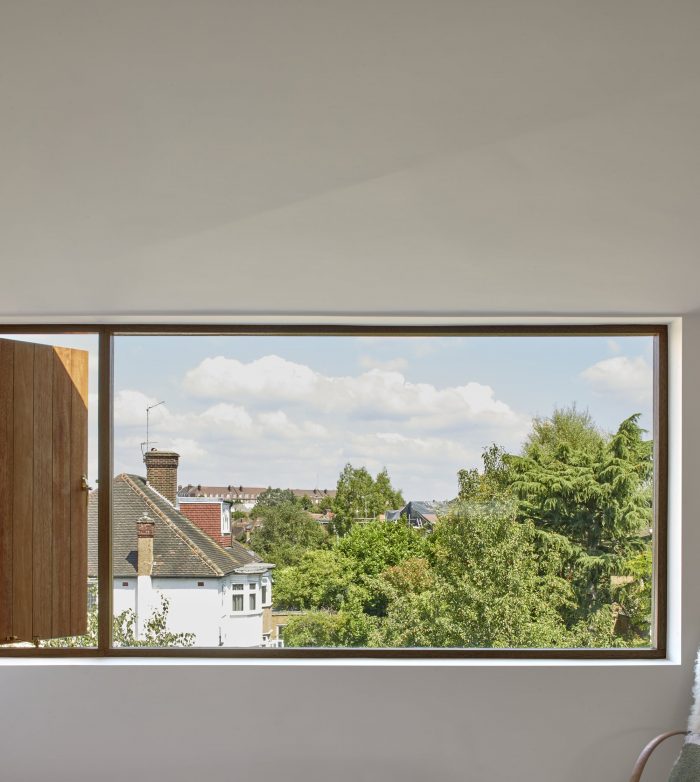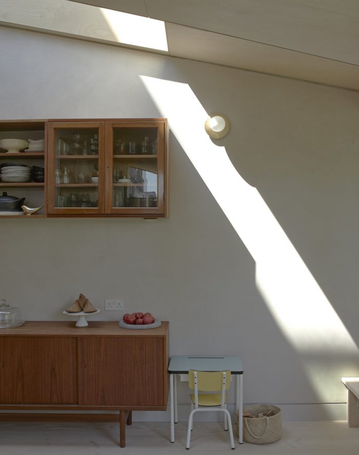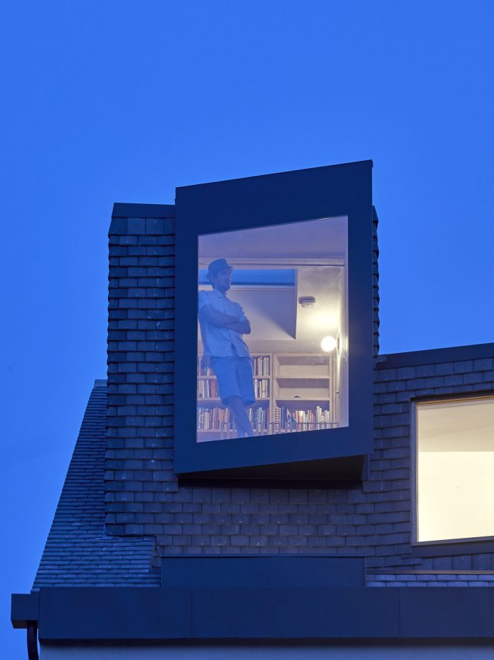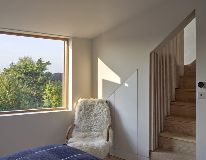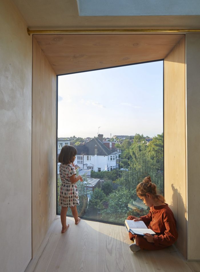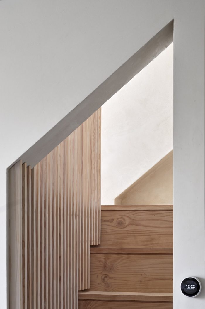 Finally, a loft conversion houses the Master Bedroom- a dream-like space that folds onto its corners with beautiful storage solutions and a second half-floor that extends upwards like a tower where you can read or gaze outwards from the heights of the roof. A house with thresholds into unique personal spaces, the atmosphere inside the house is as designed as its surfaces, with great attention to the lighting- both natural and electrical- and the ventilation.