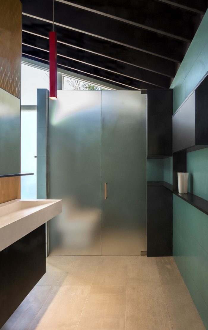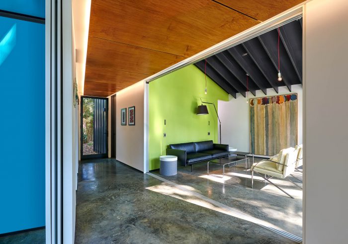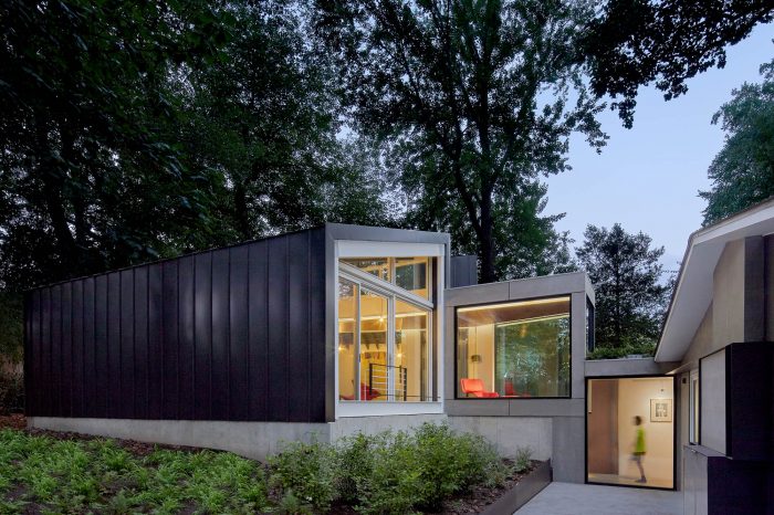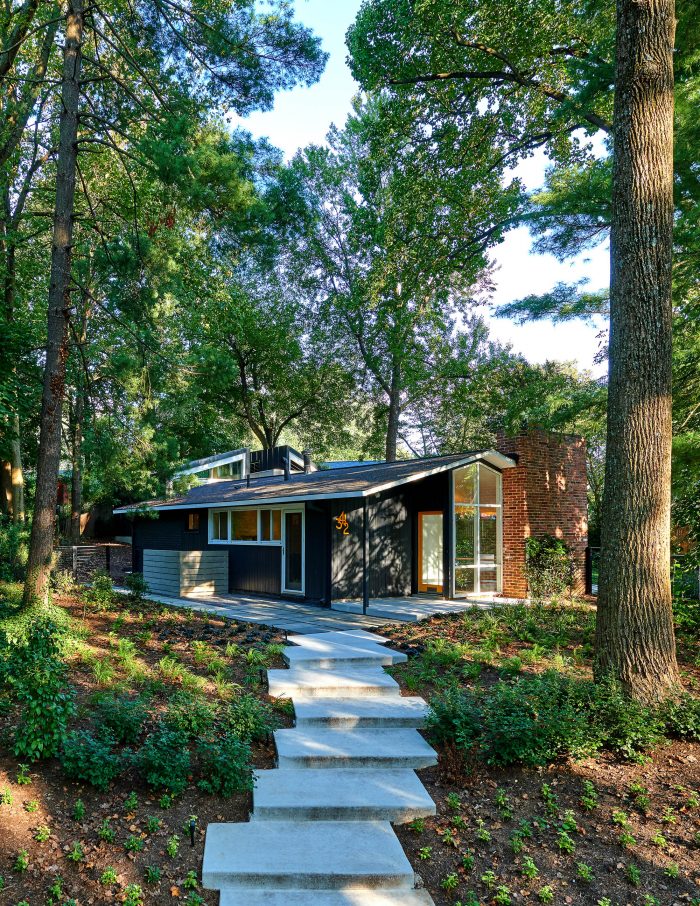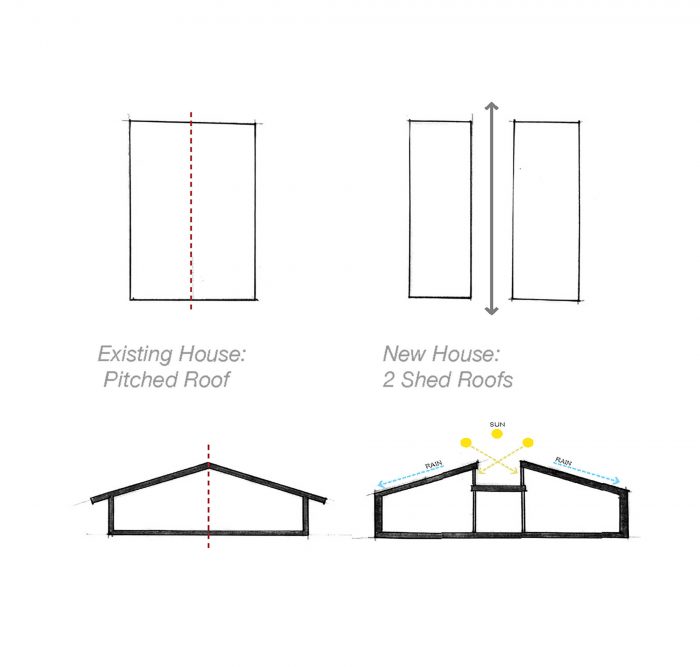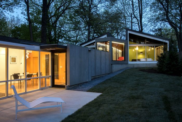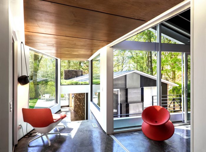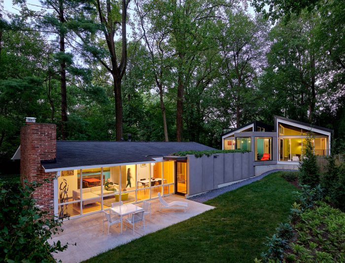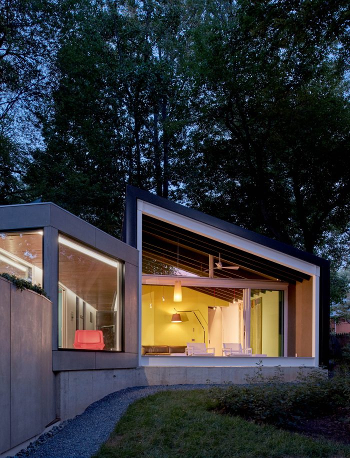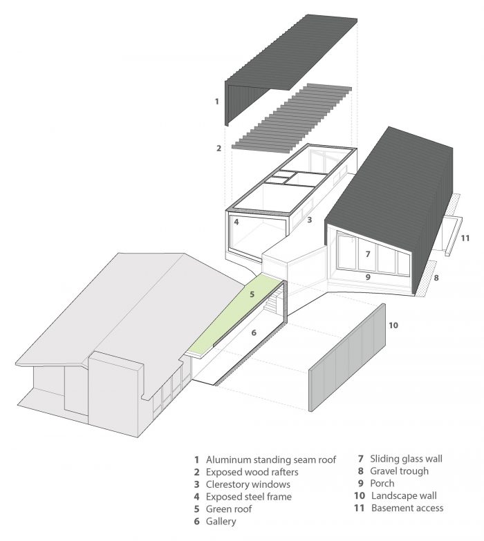 The addition, set half a level up the natural slope of the site, is separated from the existing house with a courtyard between the two. The addition utilizes the same basic tenets of Goodman’s architecture: large expanses of glass exposed structural elements, and an indoor-outdoor relationship. It follows the size and proportions of the existing pitched roof house but is comprised of two shed-roofed volumes that flank a central walkway.
