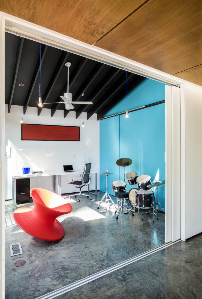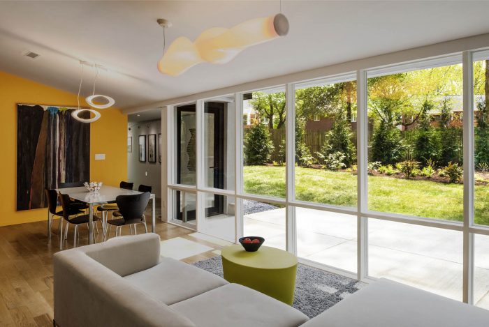 This renovation and addition to the architect’s own 1950 mid-century modern house, designed by Charles Goodman, included 2 phases. The existing Goodman structure was renovated 5 years ago, with a new kitchen, bathroom, finishes, windows, mechanical, and electrical. The floor plan was preserved, the kitchen opened up to living space, and bedrooms/bathrooms renovated.