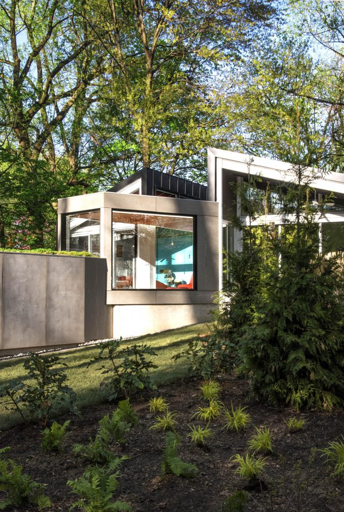 A green roof on the connecting walkway serves as a focal point from the new addition while collecting water runoff from the existing house roof. A small basement accessible from an outdoor stair contains all mechanical equipment and the electrical panel. Ductwork runs underground to the new concrete floors, providing a highly efficient air supply system. Metal roofing wraps down the sidewalls of the new structure, draining water to linear gravel troughs along the perimeter – so no downspouts or gutters are needed.
