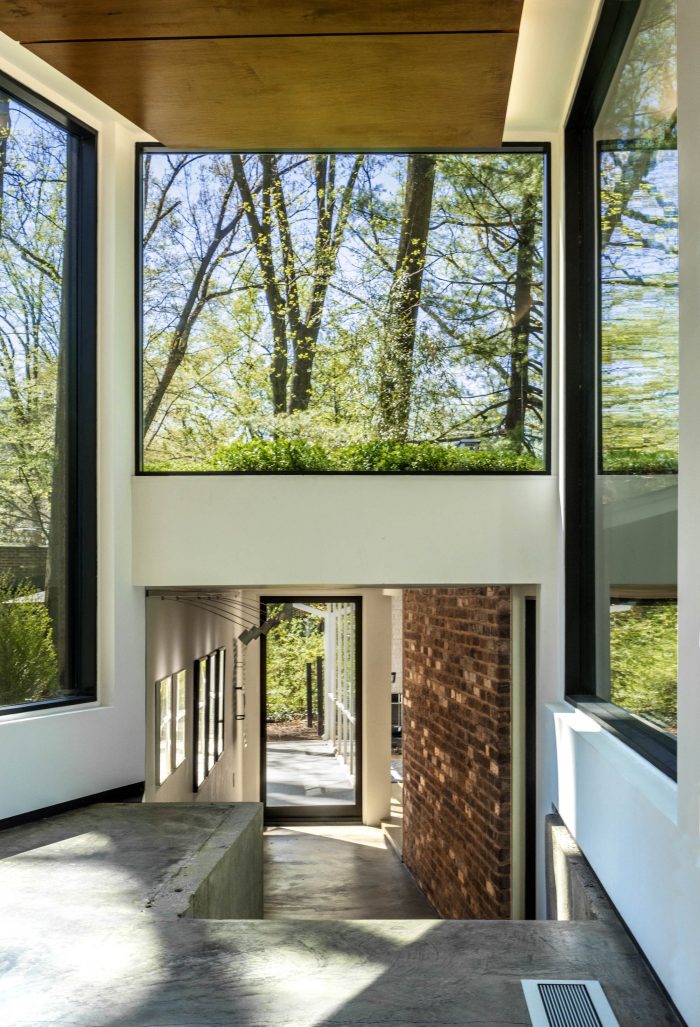 The pitch of the addition’s shed roofs allows for clerestory windows in all rooms, offering views of the many large trees on the site, all of which were preserved during construction. Each room in the addition also has a wall of full-height glass on the end, and both ends of the central walkway are glass, so the landscape serves as the main focal point. Sliding doors that pocket into the walls join the central walkway to the surrounding spaces.