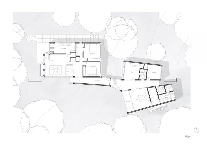 加建的棚式屋顶的坡度使所有房间都有夹层窗,可以看到场地上的许多大树,这些大树在施工中都被保留下来。每个房间的末端都有一堵全高的玻璃墙,中央走道的两端都是玻璃,因此景观成为主要的焦点。嵌入墙体的滑动门将中央走道与周围的空间连接起来。