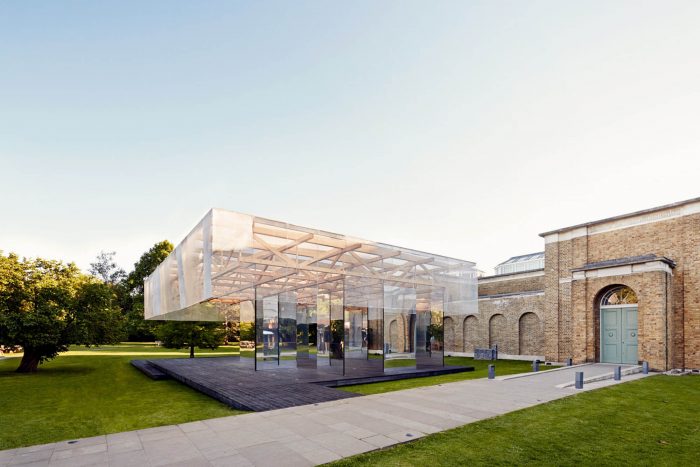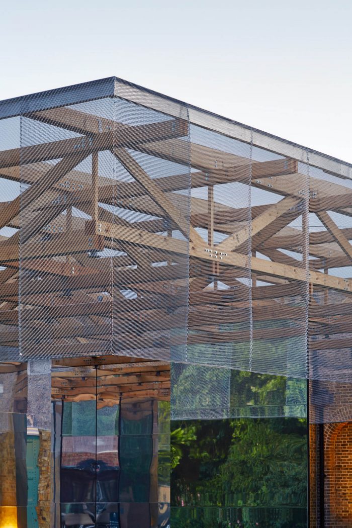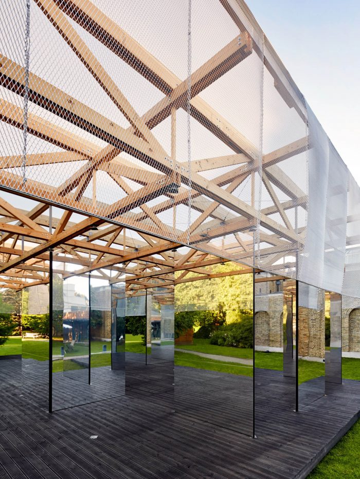 The reflective quality of the mirrored screens reflects and disrupts the context. Fragments of the building appear in the landscape, and fragments of the landscape in the building. The roof overlaid with a mesh veil creates a canopy-like environment that enhances the layering of images and the interplay of space, perception and memory: this year’s London Festival of Architecture theme.