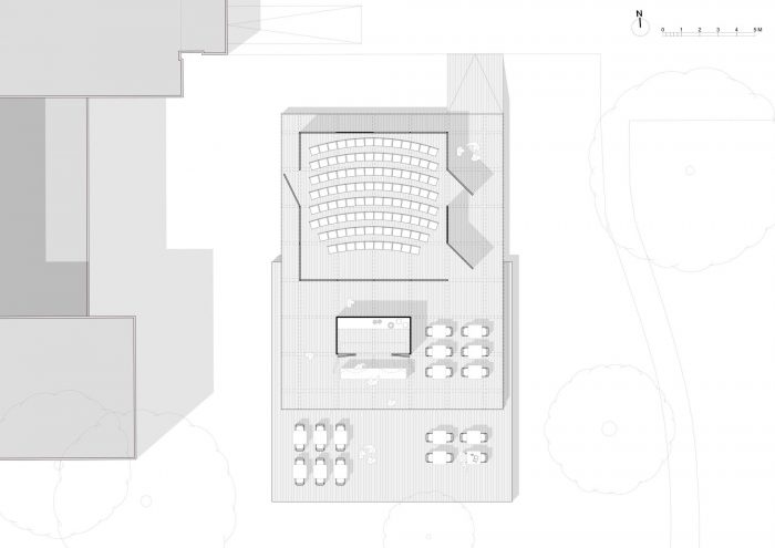 德利奇馆被设计成一个临时的公共结构,它与附近的建筑、景观和游客都有联系。在概念上,它回应了约翰-索恩爵士画廊建筑的坚固性和整体性,以及景观的多孔性和不断变化的性质。在结构上,该馆是轻量级和最小化的,包括一个木质桁架屋顶,悬挂在一个平坦的木质甲板上,由三个固定的细长镜面板支撑。所有其余的墙板都是可移动或可拆卸的,创造了一个灵活的空间,可以为不同的活动进行多种配置。一个固定的酒吧/咖啡馆在使用时可以打开,露出一个服务区。