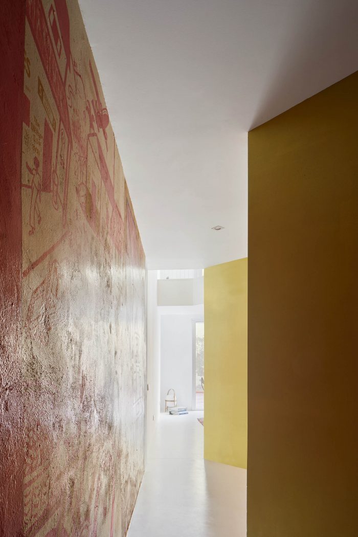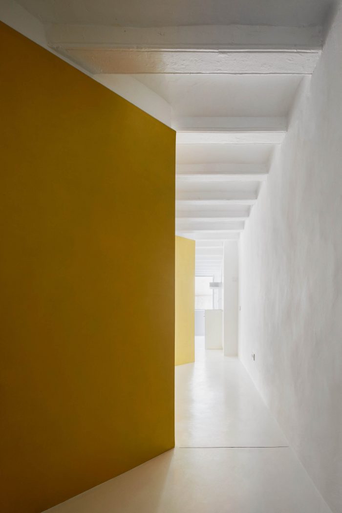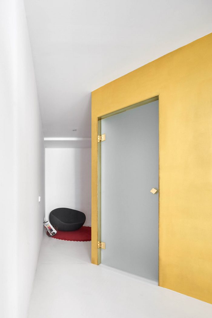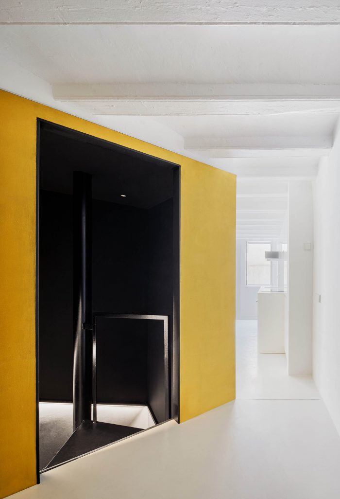 颜色和材料的处理突出了两个挤压的体量,它们被涂上光亮的金色饰面涂料,与金粉混合,并进行清漆处理,周围是白色的覆盖层(微水泥和涂料),覆盖并涂在现有的周边。挖入其中一个体量的楼梯内部是一个黑色的世界,与外部的白色形成对比,就像卧室的床区一样,被挖入另一个体量中,用涂有OSB的木板覆盖,并涂上黑色清漆。门框(全部是玻璃)和开口是黄铜或黑钢,这取决于它们通往的区域;铰链和把手也是黄铜或铬合金......。材料和颜色代码总是与它所应用的元素的性质相匹配,无论是现有的还是新的,无论是在广场内还是在广场外。