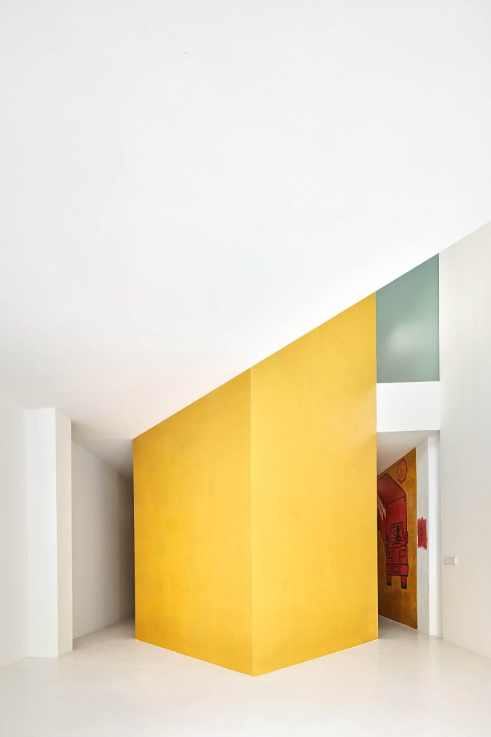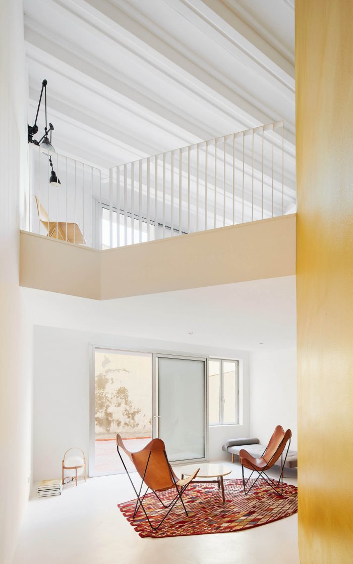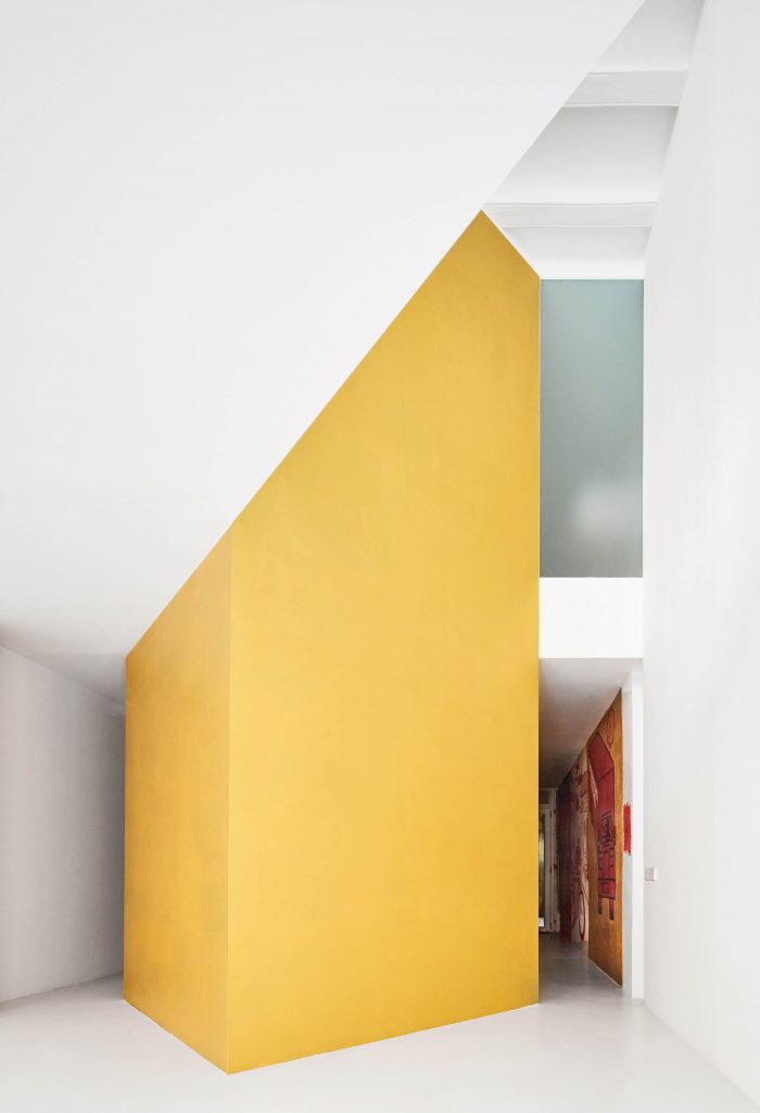 出发点是两个独立的住宅,分别位于Raval(巴塞罗那)中心地带的一楼和夹层,是一栋普通的老式公寓楼的隔墙。这两座住宅都处于被忽视和失修的状态。客户的要求是将主要的生活空间集中在夹层,并在底层扩展出其他功能更分散的空间,可用作客厅、书房、工作区...... 该建议是明确而直接的:在空间的中间,插入两个2米长的方块,在主轴线上旋转45º,它们的顶点重叠而不接触原来的墙壁,并通过两个楼层挤压。