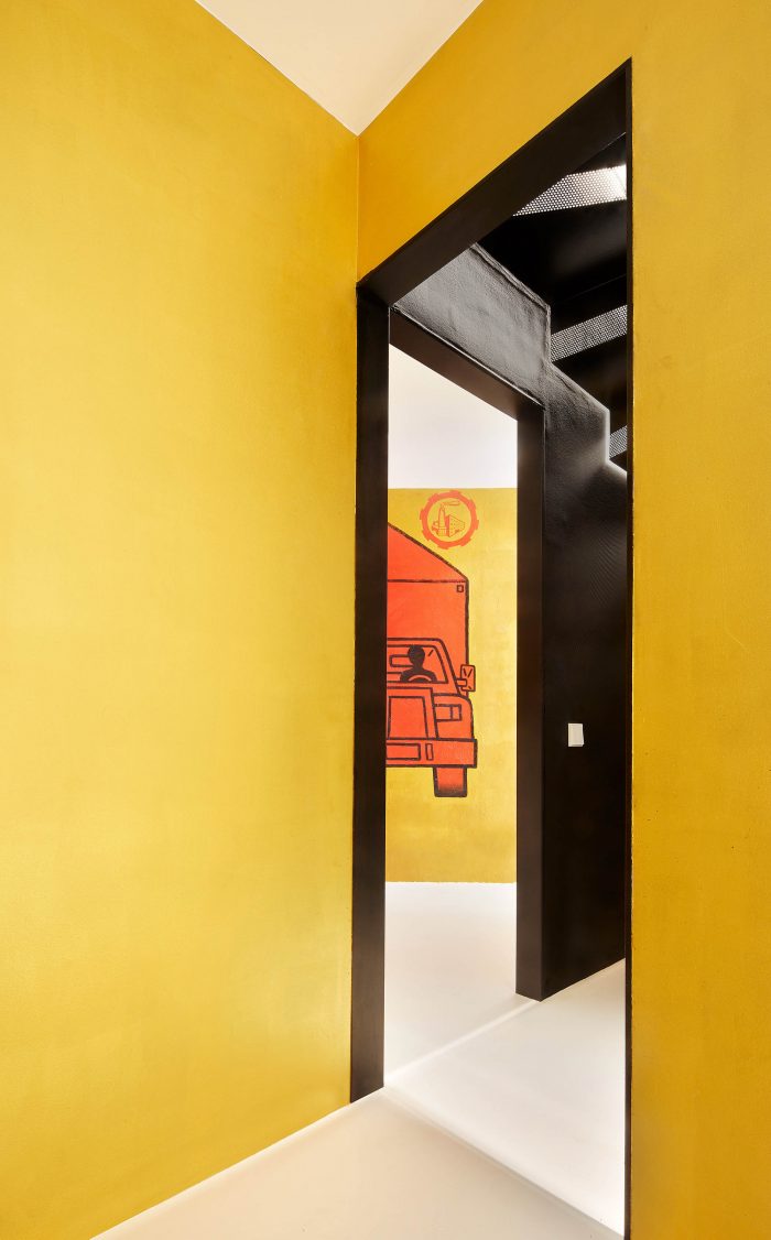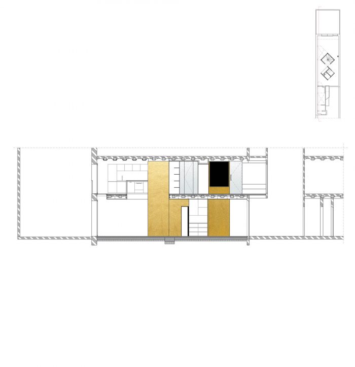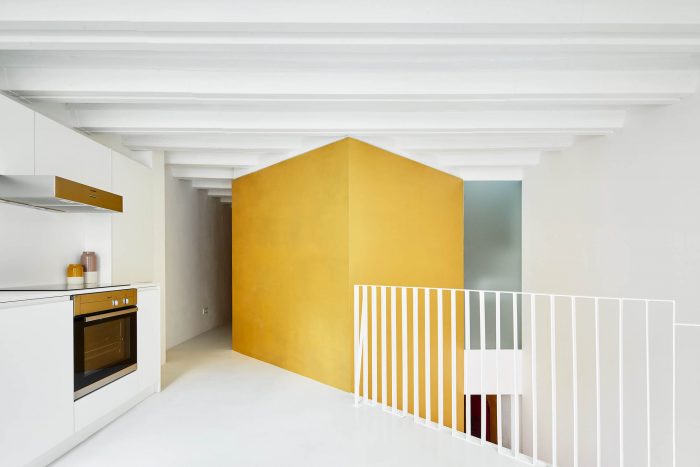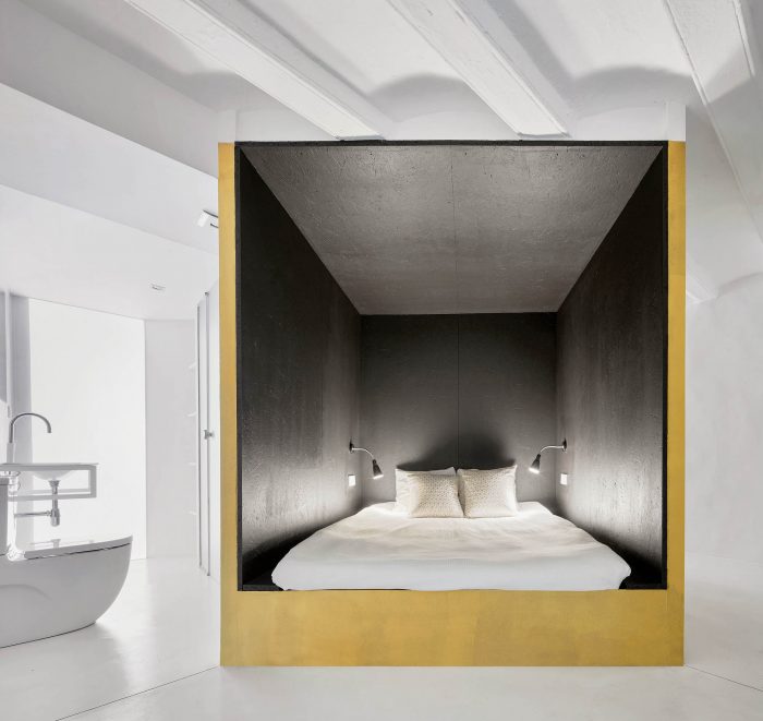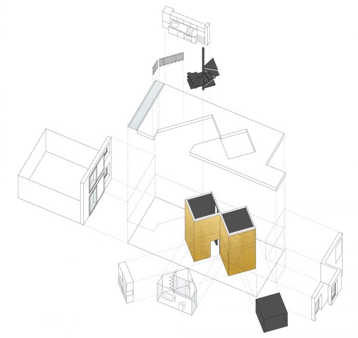 The treatment of colours and materials highlights the two extruded volumes, which are coated in glossy, gold finish paint mixed with gold powder and varnished, surrounded by white cladding (micro-cement and paint) covering and coating the existing perimeters. The inside of the staircase dug into one of the volumes, is a dark world of black contrasting with the exterior whites, just as the bed area in the bedroom, excavated into another of the volumes and covered with painted OSB wood boards and varnished in black. The door frames (all glass) and openings are either brass or black steel, depending on the area to which they give access; hinges and handles are also brass or chrome ... The material and colour code always matches the nature of the element where it is applied, whether existing or new, either inside the squares or outside.