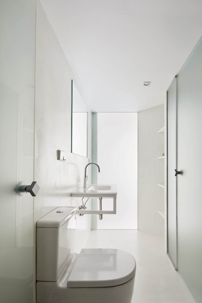 因此,楼梯被封闭在其中一个体量中,其螺旋状的模式旨在迷惑和隐藏着落脚点的惊喜;出于同样的目的,有多个对称的轴线,使流通加倍,增强了空间体验,例如,在一楼的落脚点有两个可能的出口,或所有这些轴线被放置在广场的顶点;上层的封闭浴室区,是整个建筑中最孤立和私密的,反映和展开了其负空间,一个连接两个楼层的双层高度的空区域。高度加固的顶层结构在接触外墙之前就被切断了,以玻璃地板窗格到达外墙,连接两层楼,从而隔离了现有的外墙,包括外侧的滑动木工都被置于该墙的内部平面;没有元素接触到体积,它们在内部被独立阅读,在接触天花板之前结束;灯、门把手、淋浴头、排水管. ......所有的元素都是相对于它们被插入的表面,复制了45°的转弯......