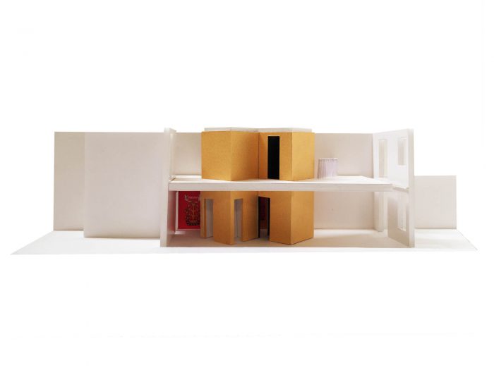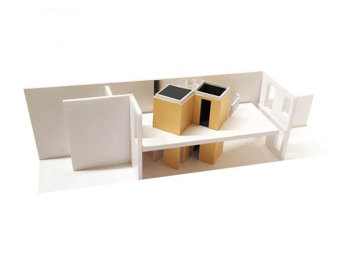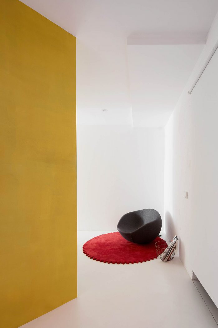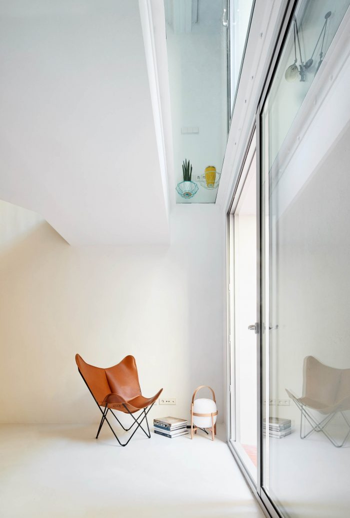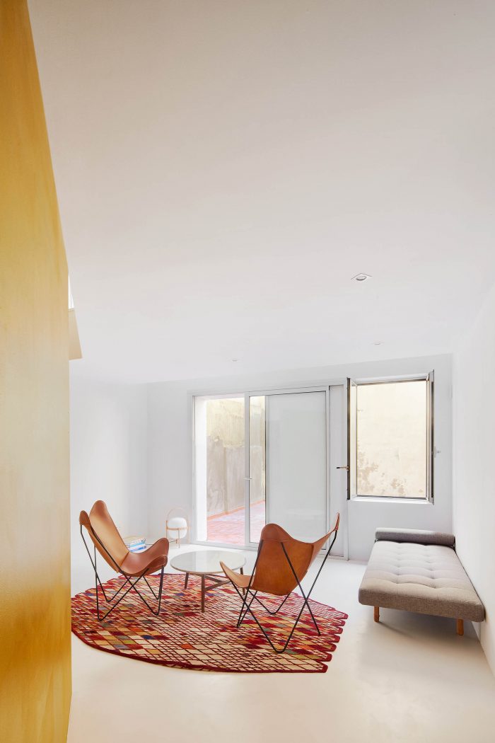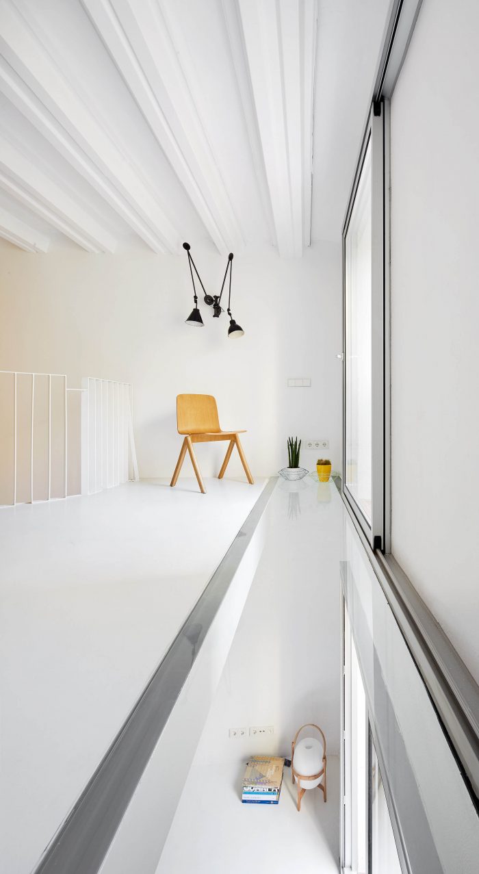 A simple and resounding arrangement in which two ideal shapes, two perfect extruded squares, are imposed on the existing irregularity and arrange all the floor space without the need for any other means or elements. One of the squares will hold the stairs communicating both floors, and the other will house the bedroom on the upper floor and the toilet and office spaces on the ground floor. The very rotation of these squares results in the specialization of the space around it without needing any additional doors or enclosures (except those that provide the required privacy to bathrooms and bedrooms), since the new volumes, as they approach and move away from the perimeter walls, define these areas. The proposal's emphasis runs parallel to the sought-after inner spatial complexity and a firm intention to underplay the different areas and circulation.