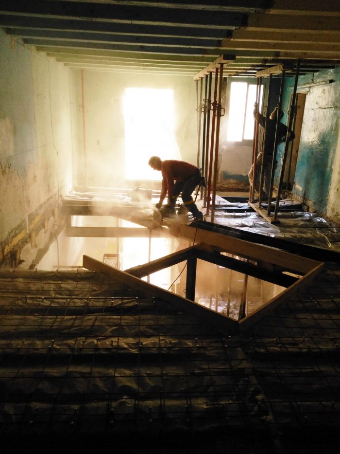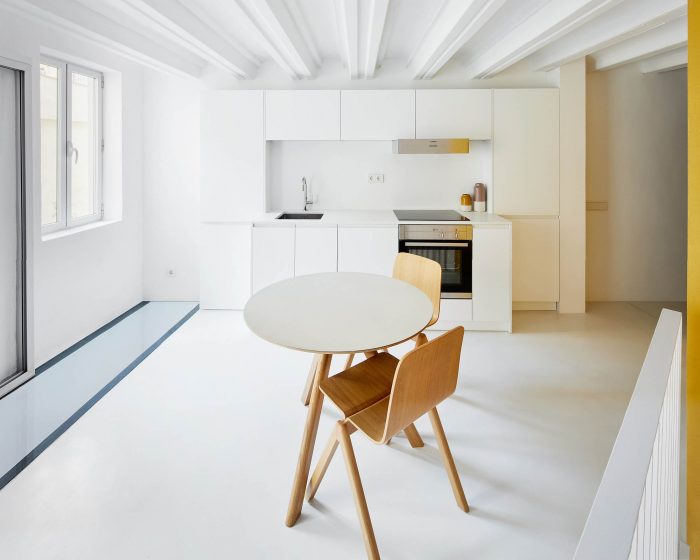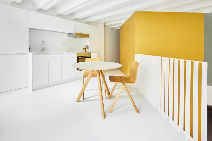 From the outset, the structural intervention required overhauling the foundation, high precision in placing the central squares, as well as the precise cutting of the existing wooden beams for the openings and double heights. The cut wooden beams either rest on the new steel porticos or lean on the lower wing of the new beams, always for the purpose of allowing the clean extrusion of the squares. The duplex is equipped with underfloor heating with a highly efficient air-therm system. On the ground floor, three existing paintings of Brazilian origin have been preserved, and the proposed inside circulation places them right at the stairs exit. These paintings are the reason the client, of Brazilian origin herself, initially decided to buy these two properties and undertake the project.