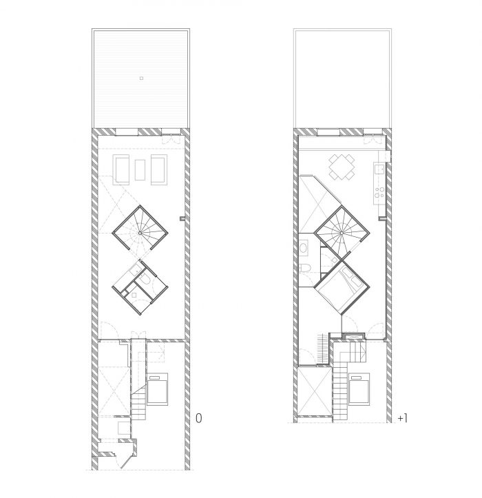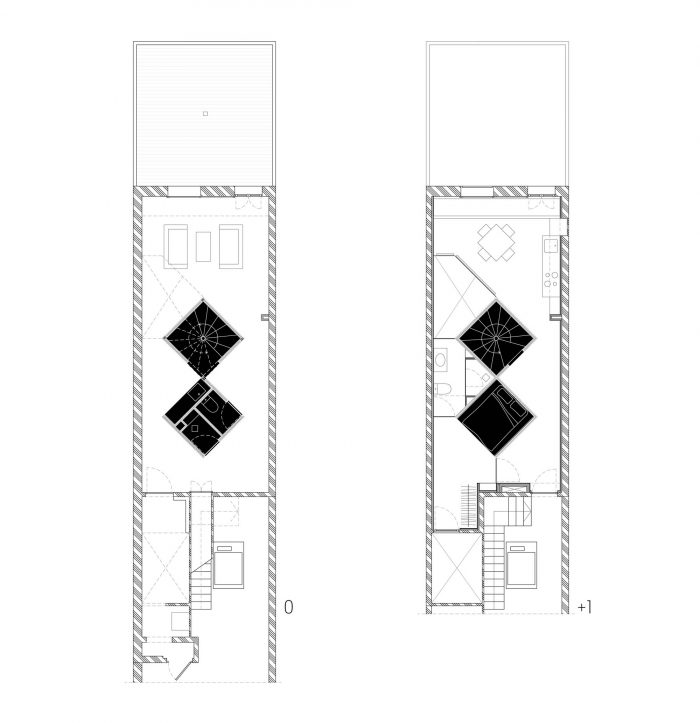 The starting point was two independent dwellings on top of each other on the ground floor and mezzanine of a modest, old apartment building between dividing walls in the heart of the Raval (Barcelona). Both dwellings were in an absolute state of neglect and disrepair. The client's requirement was to concentrate the main living spaces on the mezzanine floor and expand them on the ground floor with other spaces with more diffuse functions that could be used as living room, study, work area... The proposal is clear and direct: in the middle of the space, insert two 2-meter side squares rotated 45º over the dominant axis, their vertices overlapping without touching the original walls, and extruded through both floors.
