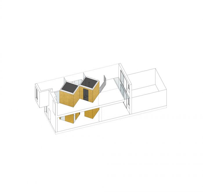 一个简单而响亮的安排,两个理想的形状,两个完美的挤压方块,被强加在现有的不规则上,并安排所有的地板空间,而不需要任何其他手段或元素。其中一个方块将容纳沟通两层楼的楼梯,另一个方块将容纳上层的卧室和底层的厕所和办公空间。这些广场的旋转导致了周围空间的专业化,而不需要任何额外的门或围墙(除了那些为浴室和卧室提供所需隐私的门或围墙),因为新的体量,当它们接近和远离周围的墙壁时,定义了这些区域。该提案的重点与所追求的内部空间的复杂性和强调不同区域和流通的坚定意图并行不悖。