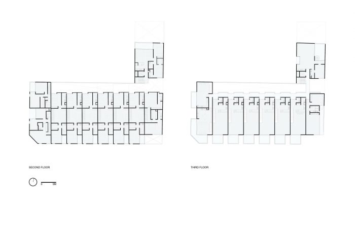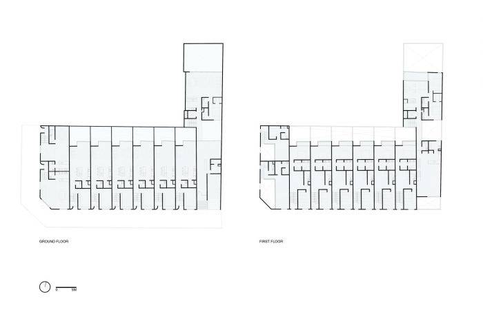 在前两层,我们提出了一系列的梯形房屋,从街道上有独立的出入口。底层在人行道上提高了半层,以保护住宅的隐私以及他们与行人和街道的关系。