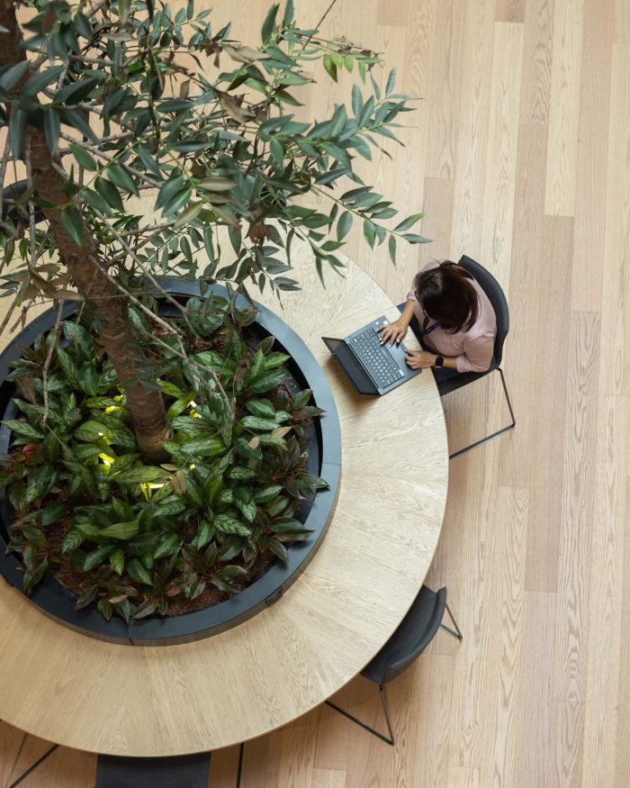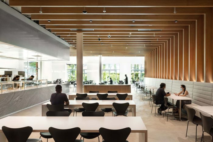 Creating a sustainable and human-centered campus - Healthy materials address wellness while advancing Dyson’s carbon net-zero goals. Engineered to a Green Mark Platinum standard, the design leverages smart building technologies, energy reduction strategies, and resource stewardship programs. Air quality monitoring and adjustable furniture support comfort and increase productivity. A range of amenities from quiet zones to medical, parent, and prayer rooms support inclusive physical and emotional well-being. In the central spaces of this Singapore office design for Dyson, trees improve air quality and thermal comfort. Also, a landscaped rooftop terrace brings nature to the adjacent meeting spaces. This sympathetically repurposed building is a rare example of architectural renewal and urban sustainability.