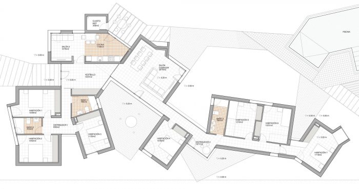 This visual relationship between the mountain and the town establishes a dialogue that materializes in constructing a very particular perimeter. This outline is made up of an internal façade with open patios that fold back on themselves. A series of openings in the external perimeter function like photographic objectives, looking for particular views. Thanks to their dimensions, these openings acquire the conditions of rooms, taking advantage of the visual relationship with the landscape to the extreme.