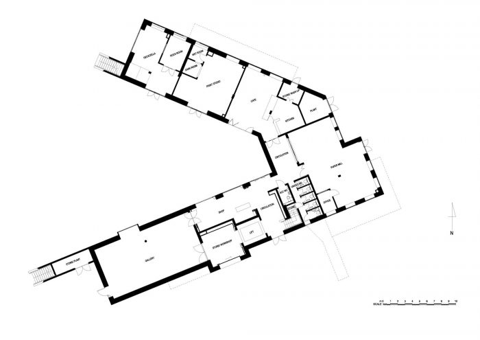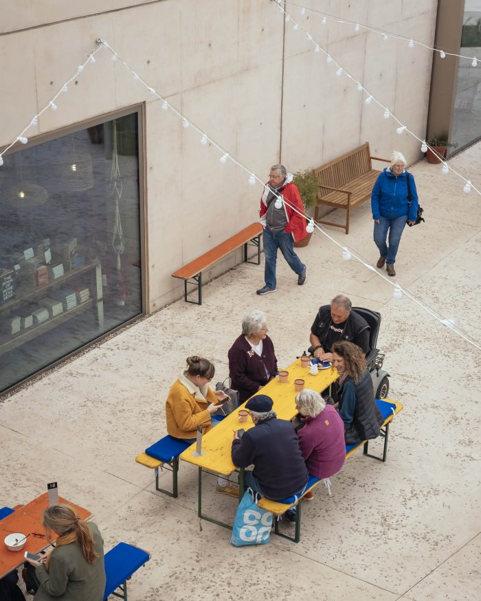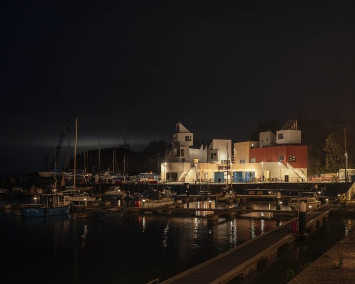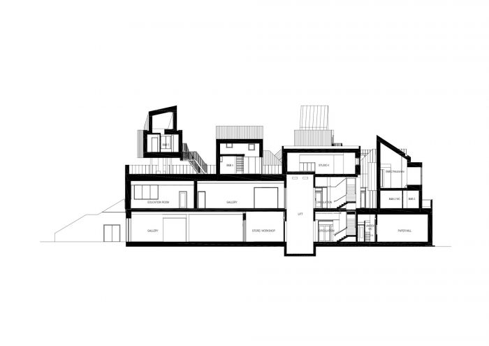 The center draws inspiration from both the built environment and the natural landscape. A solid plinth reflects the harbor wall and nearby cliffs, containing the reception, gallery space, restaurant, and artists’ studios. External stairs lead up to the upper level which connects directly to coastal paths, allowing East Quay to become a porous object that can be climbed, traversed, and explored. The ground-floor restaurant opens out onto a new public space where local people and visitors alike can sit and enjoy views back into town, as well as the boats in the marina and the sea beyond.