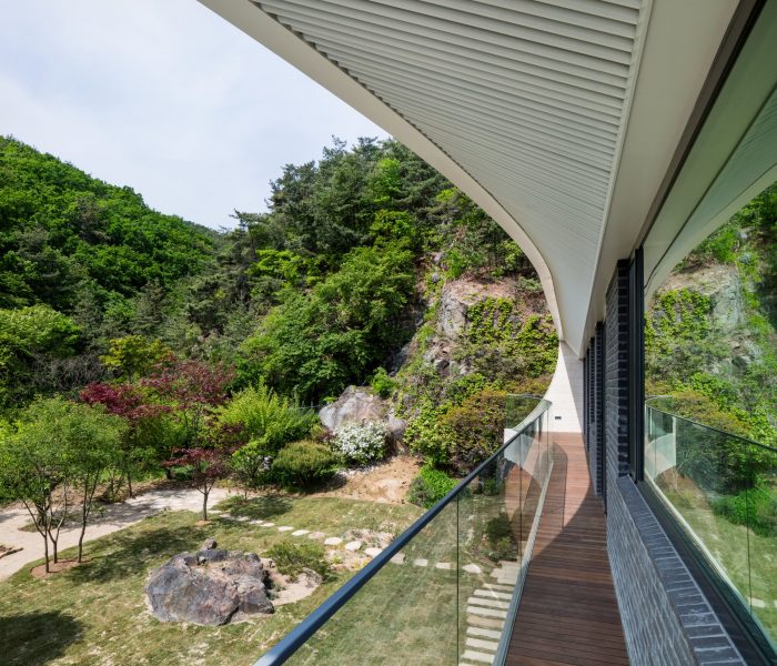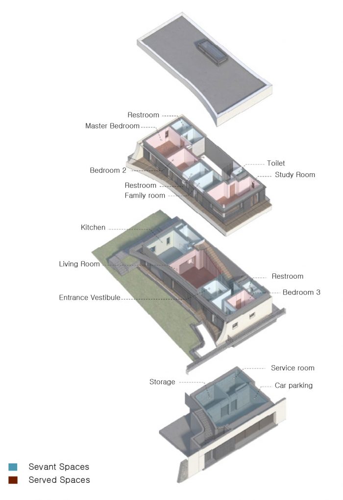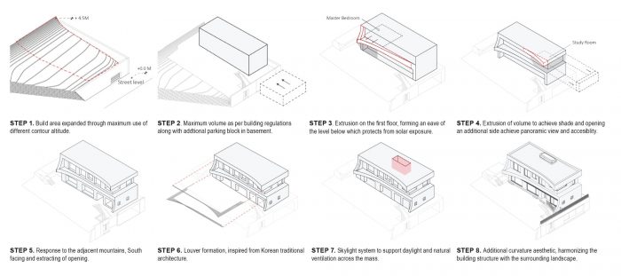 Eaves house, a home for a couple in Gwacheon, portrays how to re-interpret traditional Korean eave typology to achieve high environmental and aesthetical standards. Located in between Gwanaksan Mountain and Cheonggyecheon Mountain, the site offers a panoramic view of its surrounding mountains. The project aims to achieve an architectural outcome where the balance between nature perseverance and spatial experience coexist. Additionally, a continuous interplay between light and shadow along with various scenery interchanges are expected to tag along in the process.