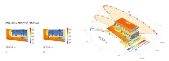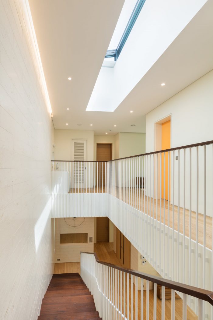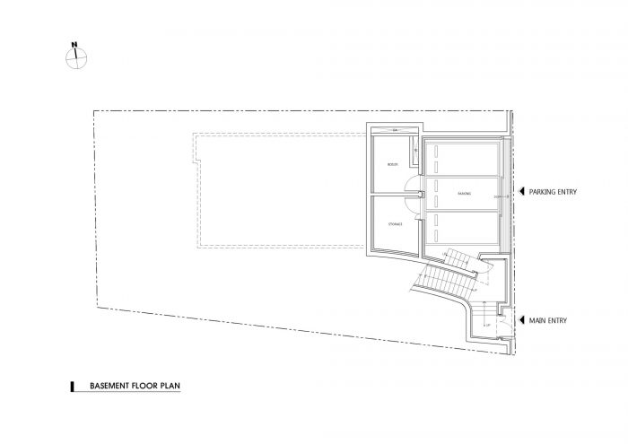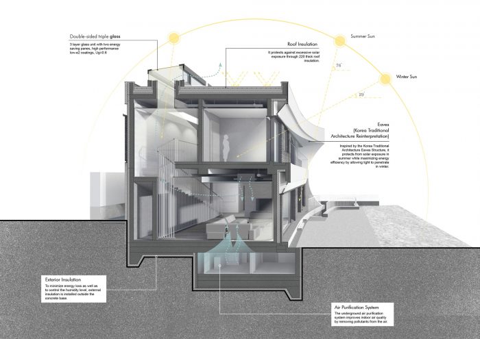 Passive Housing - Eaves house is sealed off with a high-level airtight construction and insulation, internally isolated from any external intervention. In supporting inhabitation, the house adopted a Passive Housing Standard to circulate essentials energy within. The introduction of the heat recovery system (HRV) supports the realization of high-performance ventilation and air filtration to the house. In the basement, low noise filters were installed, drawing in toxic exhaled air from inside while circulating fresh air from outside throughout internally. These measures effectively reduce the annual energy consumption of the client through design and construction.