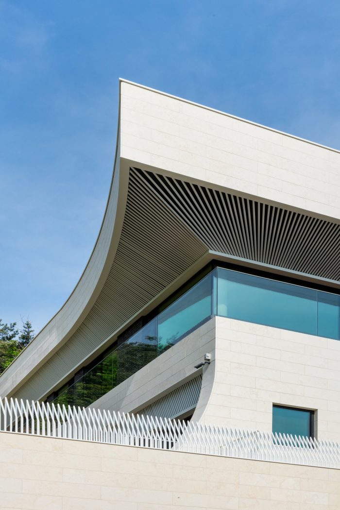 Eaves, the evolving hereditary paradigm - The eaves, highlighted as the main feature of the design, were inspired radically by the Korean Traditional Roof (Cheo-ma). Structured underneath are white-painted stainless pipes, patterned respectively as reflections upon the original Korean traditional aesthetics. The design re-interpreted the structural function to suit the modernized era. These composed lines filter sunlight in the daytime while controlling light emission from installed lightings at night.