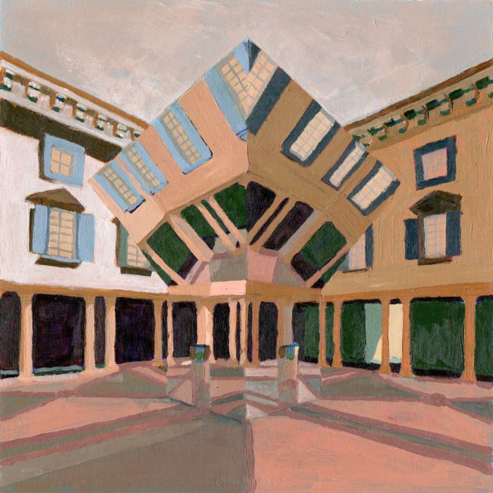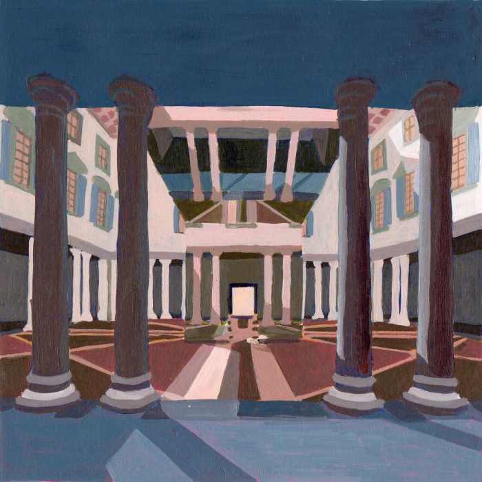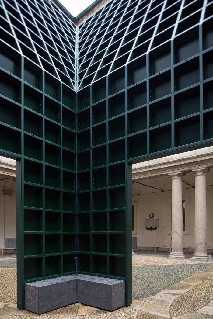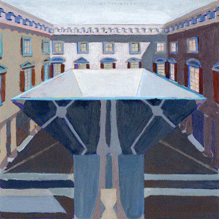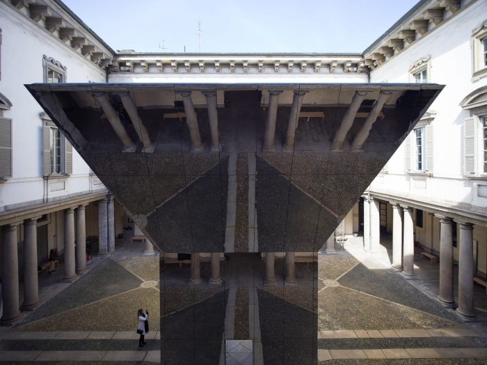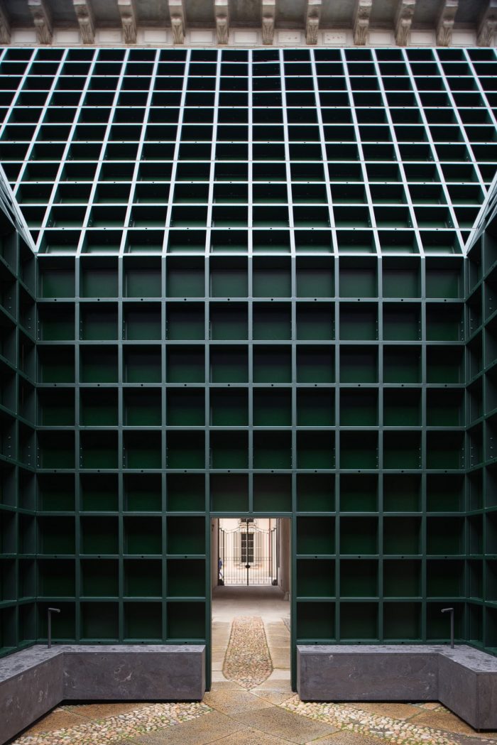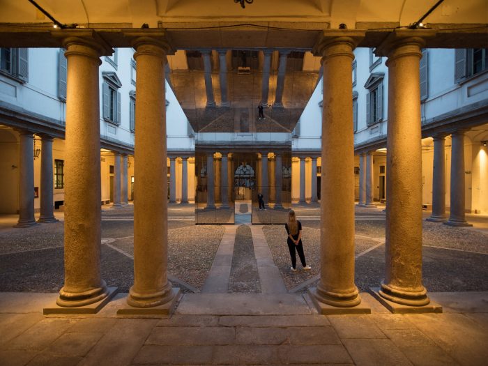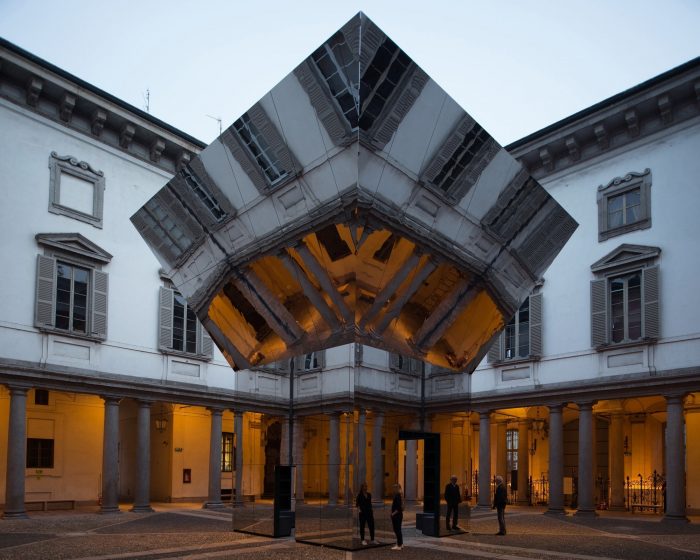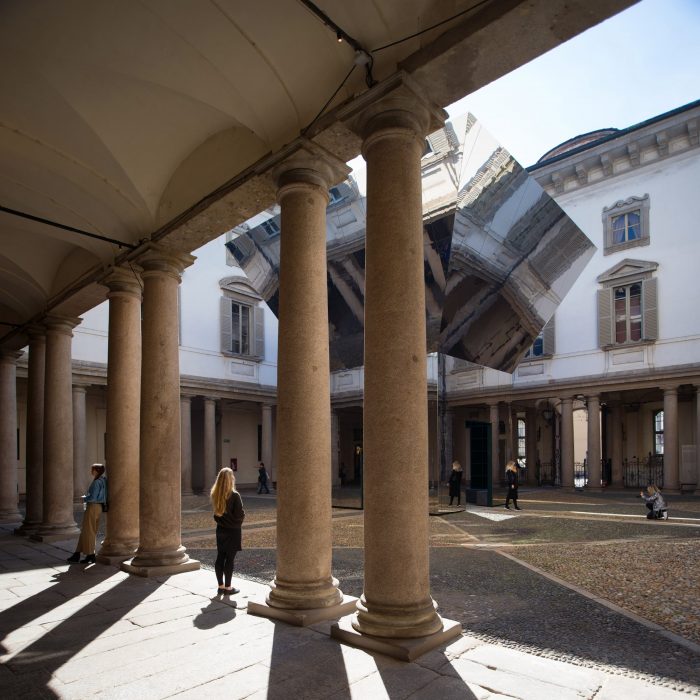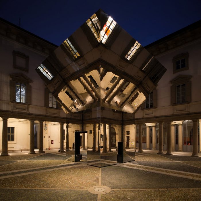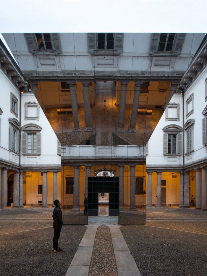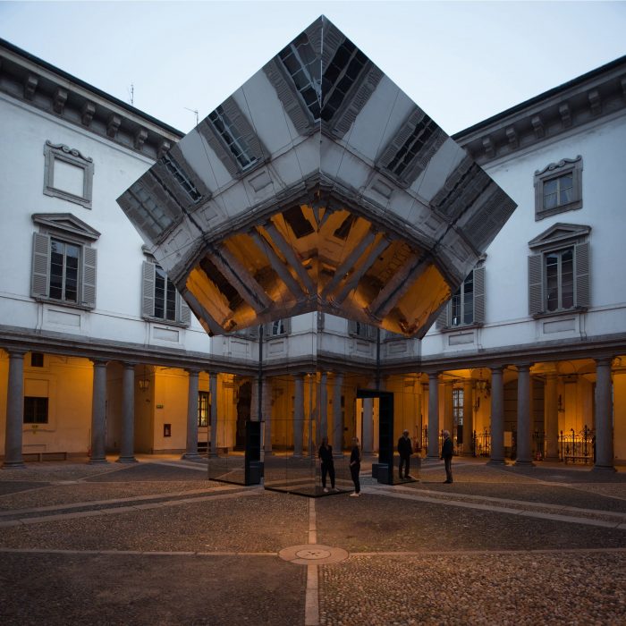 Since the material of the pavilion is polished stainless steel, both the vertical and the inclined planes become a mirror of the stone pavement, the colonnades and the corridor beyond. In its radical simplicity, the pavilion turns into an immaterial presence that, almost as in a fleeting mirage, captures the discreet beauty of the three hundred and seventy-year-old palazzo on its flat surfaces.