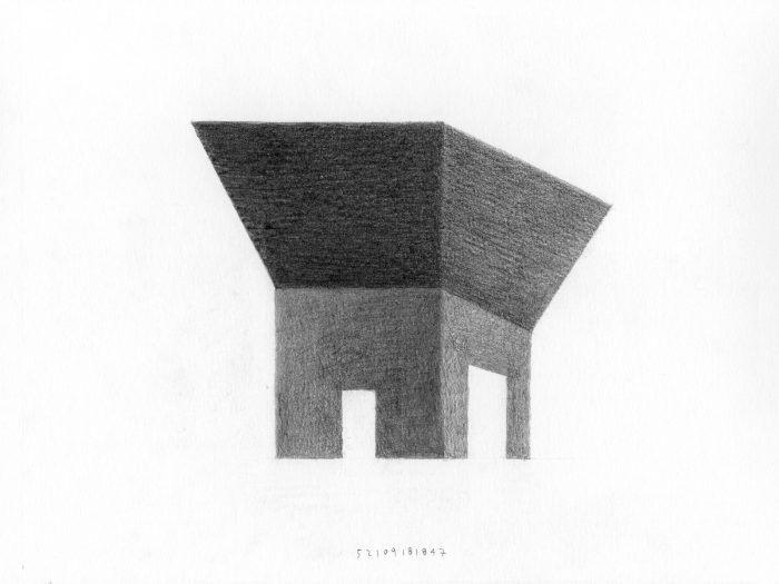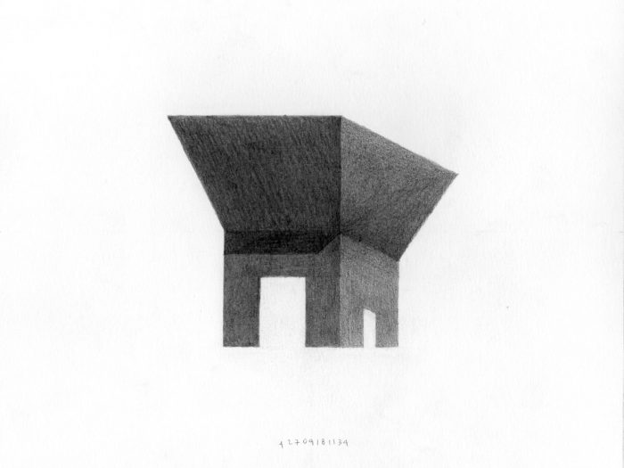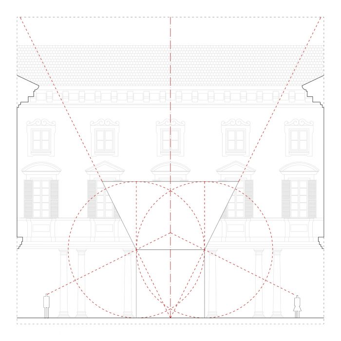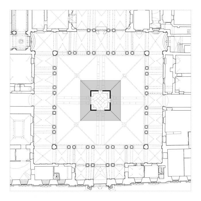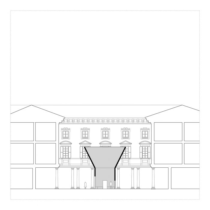 The building is both receded and expanded, visible and invisible, solid and ethereal. It is a deceiving object, a figure that resonates with the dimensions and proportions of the existing baroque palazzo. This object is a magic open box (perhaps Pandora's one) that repeats the square (1:1 ratio) of the courtyard, with a silhouette defining two levels: following the existing axis, the lower one is a compact central room (5m in plan) with four accesses and the higher one is an inverted pyramid extended symmetrically in every cardinal direction (10m in plan). The inclination of the higher stratum (1:2 ratio) is directed towards the perimeter of the courtyard.